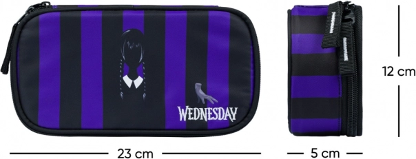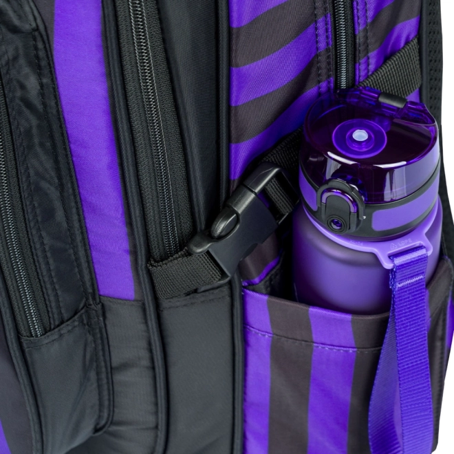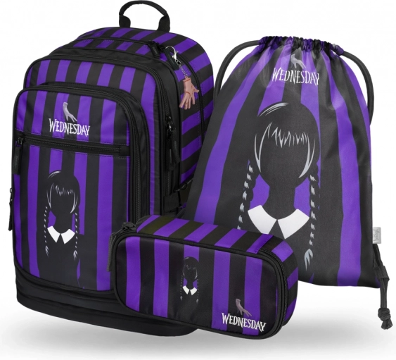 Cubic Wednesday komplektā ietilpst stilīga mugursoma, praktisks penālis un apavu maisiņš – viss modernā dizainā ar melnām un violetām svītrām. Mugursoma izstrādāta, lai atbilstu ergonomiskajām vajadzībām, savukārt penālis un maisiņš nodrošina skolas piederumu un brīvā laika lietu kārtību.