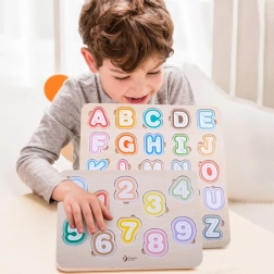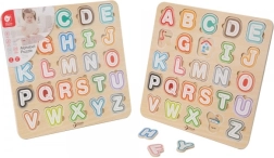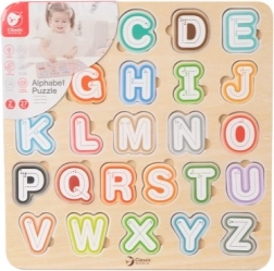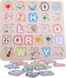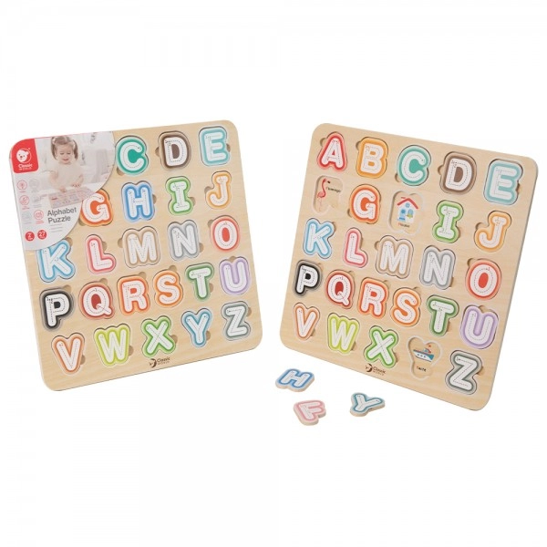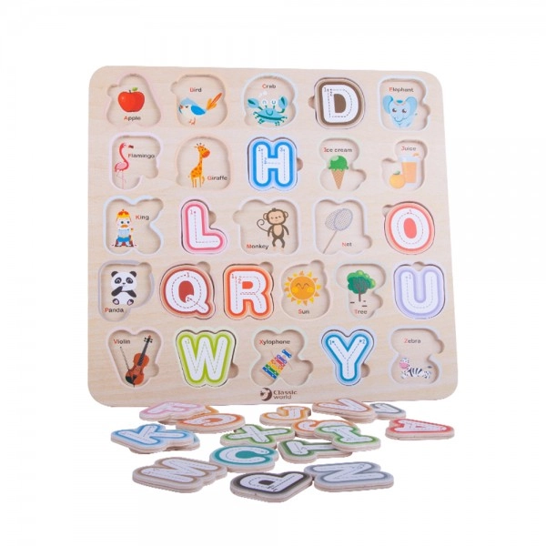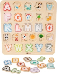 Šī kvalitatīvā koka alfabēta puzle ar izmēru 30 × 30 cm atbalsta pirmos soļus lasīšanā un rakstīšanā. Krāsainos noņemamos gabaliņus bērni ievieto atbilstošajās formās, tā trenējot acu-roku koordināciju un telpisko domāšanu. Pateicoties attēliem zem burtiem, rotaļīgā veidā tiek apgūti arī angļu vārdiņi.