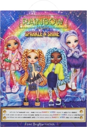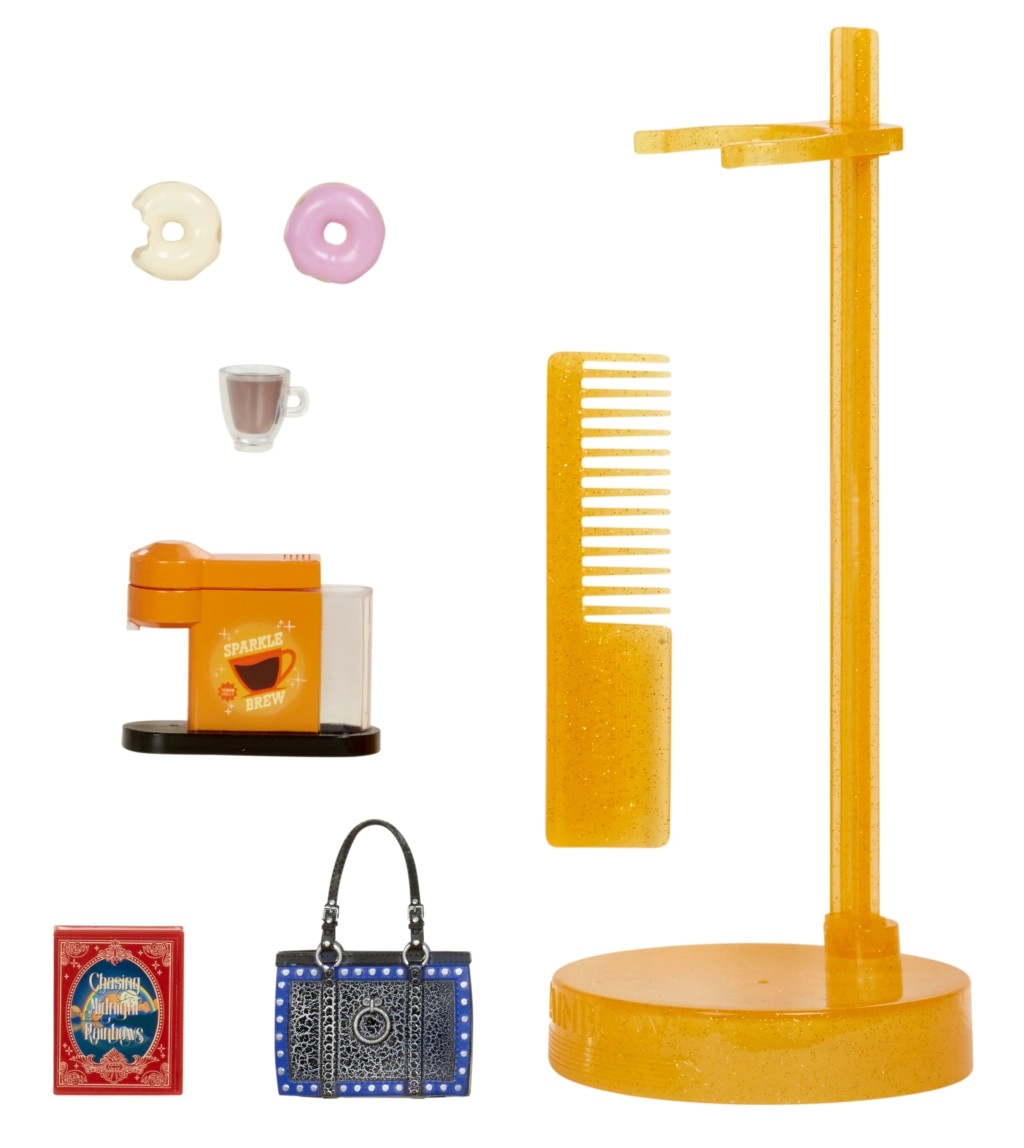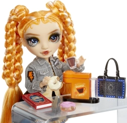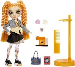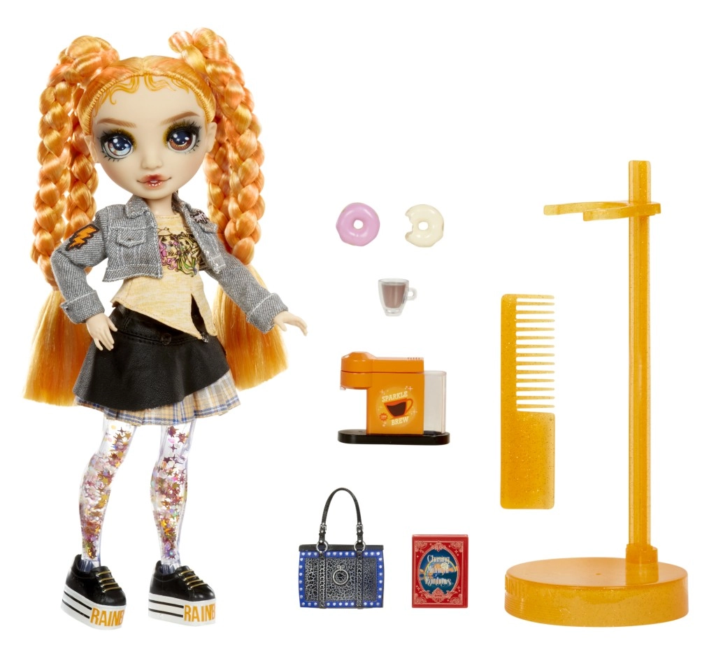 Lelle RAINBOW HIGH Sparkle & Shine Clementine piedāvā spilgtu oranžu izskatu, džinsa jaciņu, rūtainu svārku un platformas kurpes ar uzrakstu RAINBOW. Komplektā ietilpst statīvs, ķemme un tematiski kafijas motīva aksesuāri, kas paplašina spēļu iespējas un sižetus.