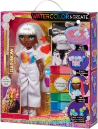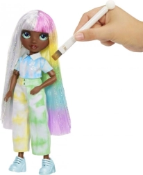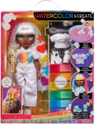 Atklāj krāsu pasauli ar radošo lelli RAINBOW HIGH Watercolor & Create. Iebēr pulveri ūdenī, iemērc matus vai apģērbu un ar sūklīti veido oriģinālus rakstus. Izmanto gumijas batikošanai un izveido unikālu streetwear izskatu. Krāsas ir nomazgājamas, tāpēc vari stilu mainīt atkal un atkal.