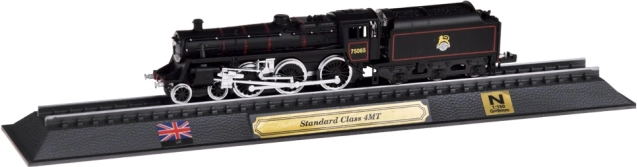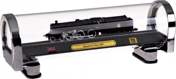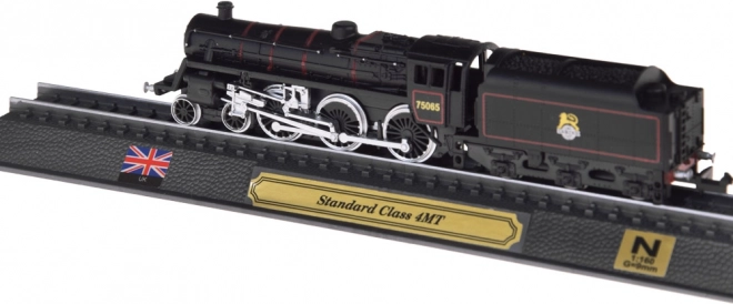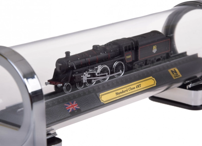 Šis detalizētais britu tvaika lokomotīves STANDARD CLASS 4MT modelis ir lieliska izvēle dzelzceļa entuziastiem un stilīgu dekoru cienītājiem. Precīzs izpildījums mērogā 1:160 izceļ autentiskas detaļas, kontrastainu krāsojumu un smalku riteņu līniju iezīmējumu. Modelis ir nostiprināts uz sliežu posma elegantā pamatnē ar plāksnīti, Apvienotās Karalistes karogu un mēroga norādi.