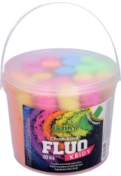 Komplektā ietilpst 20 gab. fluorescējošu krītiņu ērtā spainītī.