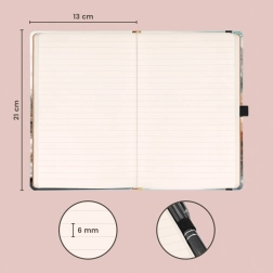 Praktiskais 13 × 21 cm formāts ietilpst lielākajā daļā mugursomu un somiņu, tāpēc der darbam, skolai un ceļojumiem. Iekšējā kabata pasargās brīvlapas, vizītkartes vai uzlīmes, lai jūsu piezīmes vienmēr būtu perfekti sakārtotas.