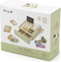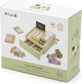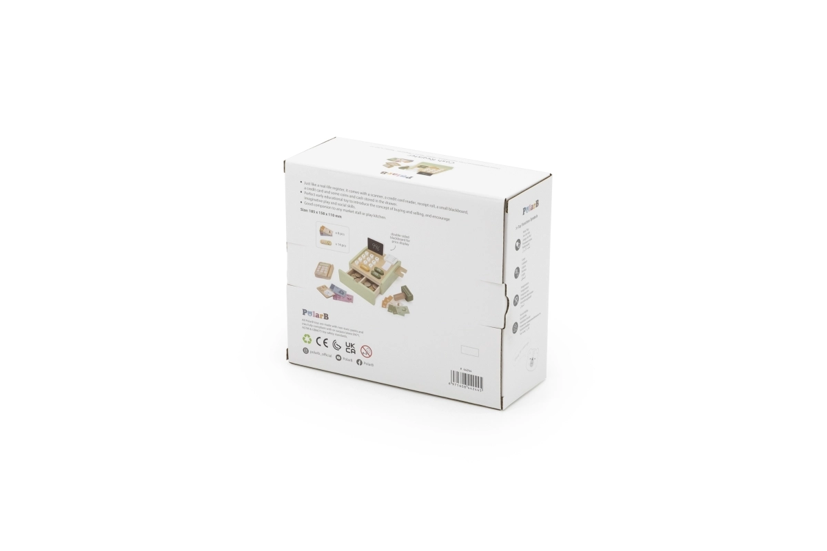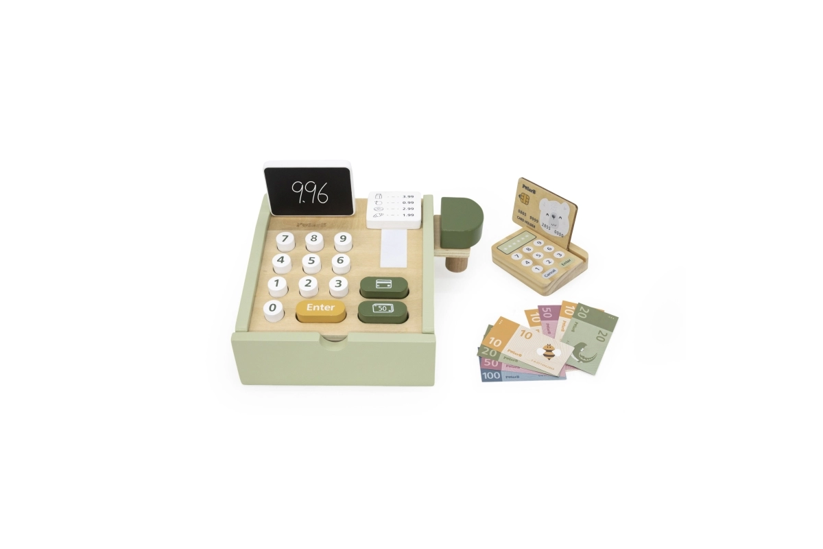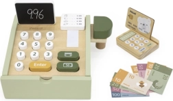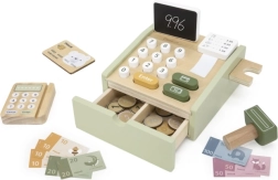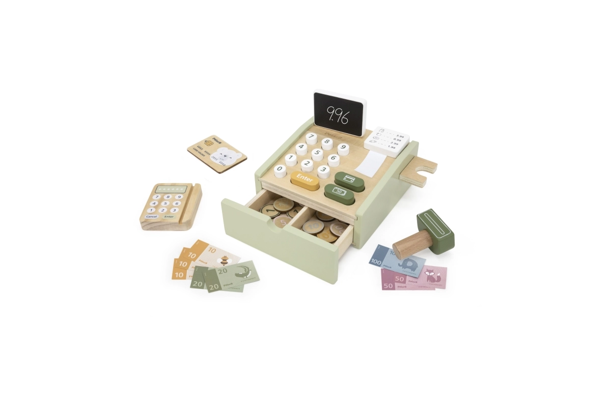 Koka kase patīkamā zaļā krāsā ir lieliska mācību rotaļlieta bērniem no 3 gadu vecuma. Tā piedāvā funkcionālus elementus, piemēram, izvelkamu atvilktni, pogas, skeneri, karšu termināli un papīra rulli, kas uzticami atdarina īstu kasi. Komplektā ir arī divpusēja mini tāfele rēķinu pierakstīšanai.