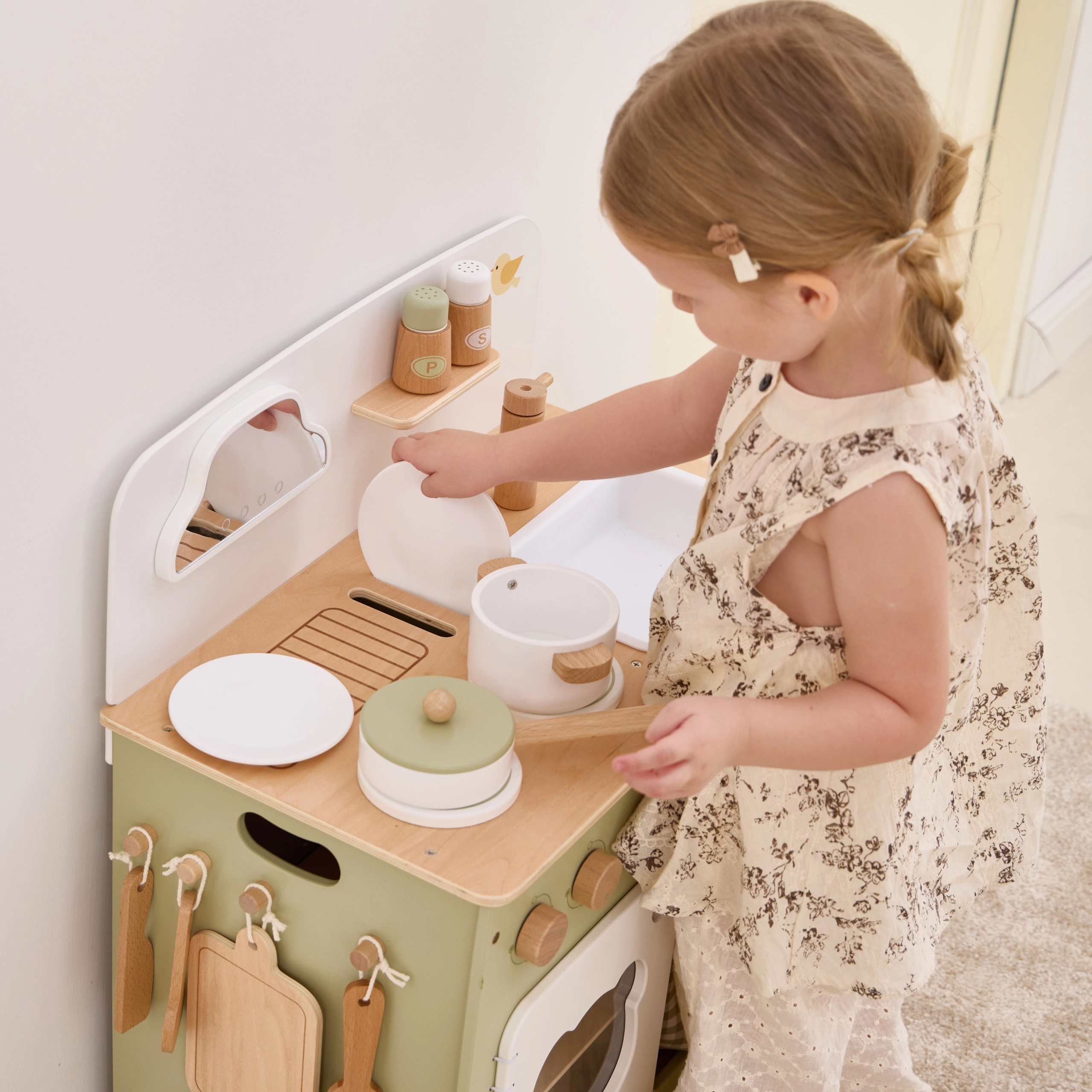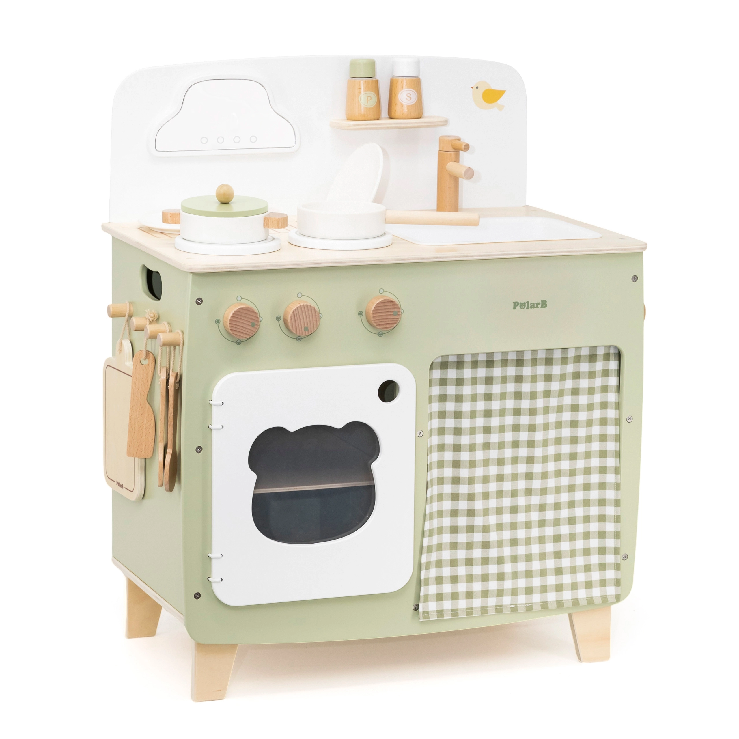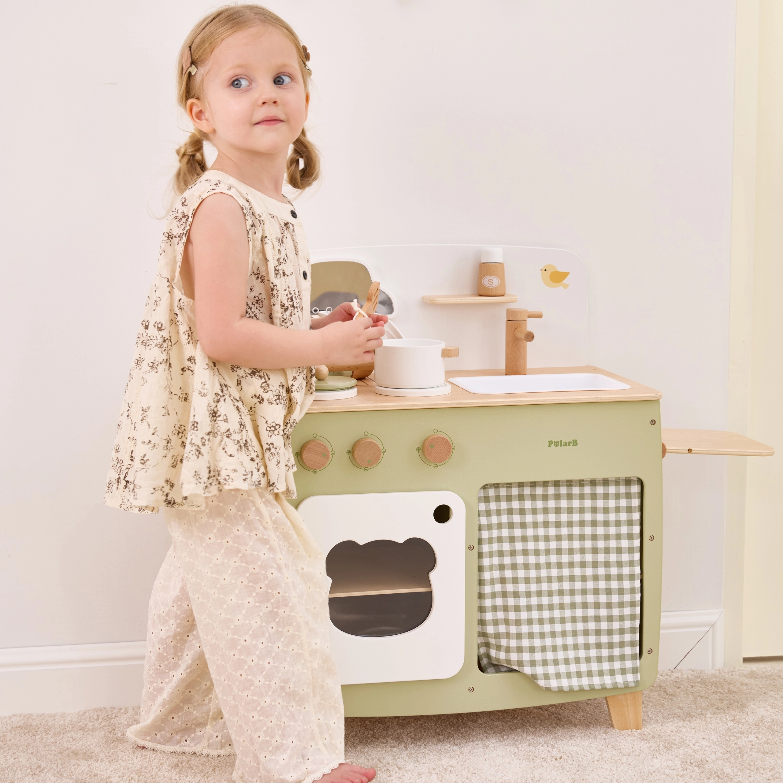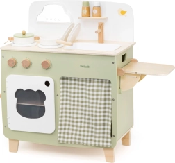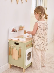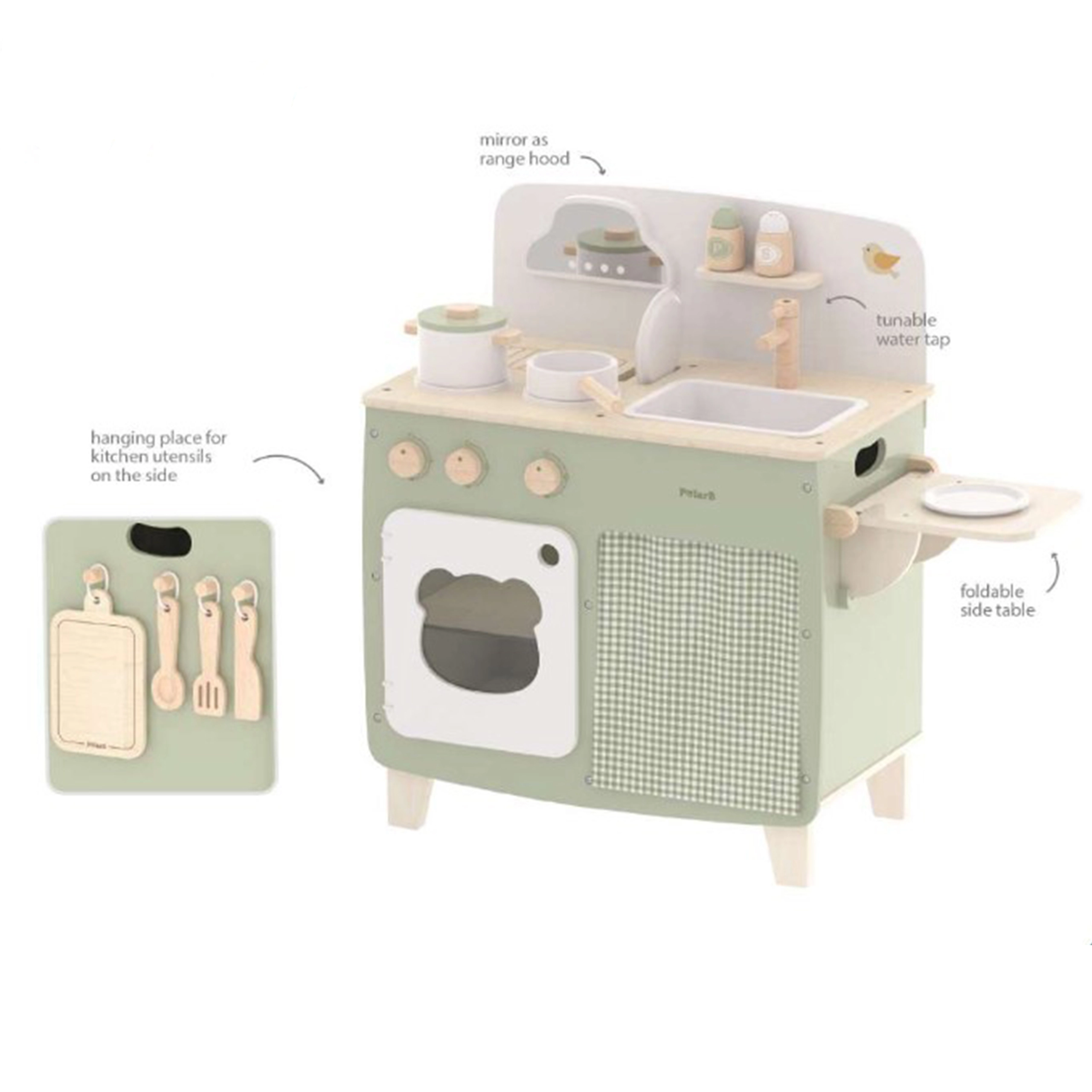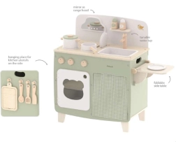 Stilīga bērnu virtuvīte patīkamās dabas un zaļos toņos piedāvā bērniem reālistisku gatavošanas pieredzi. Pateicoties izturīgajai koka konstrukcijai, grozāmajiem kloķiem, izlietnei un krāsnij, mazie pavāri baudīs stundām ilgas drošas un radošas rotaļas. Praktiskais nolokāmais sānu plaukts paplašina darba virsmu griešanai vai maltītei, savukārt skapītis ar aizkaru paslēps visus dārgumus.