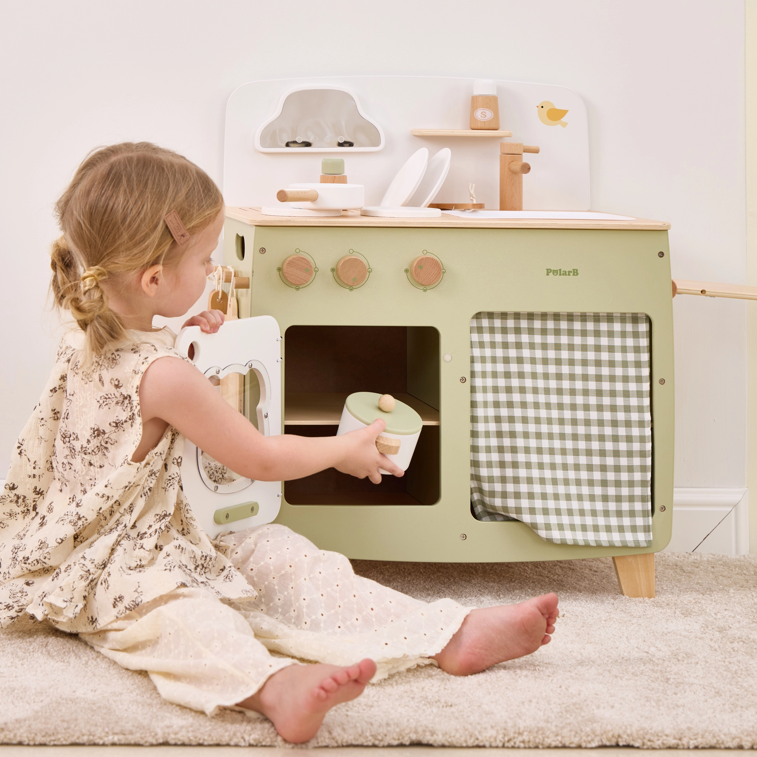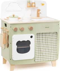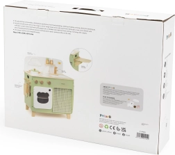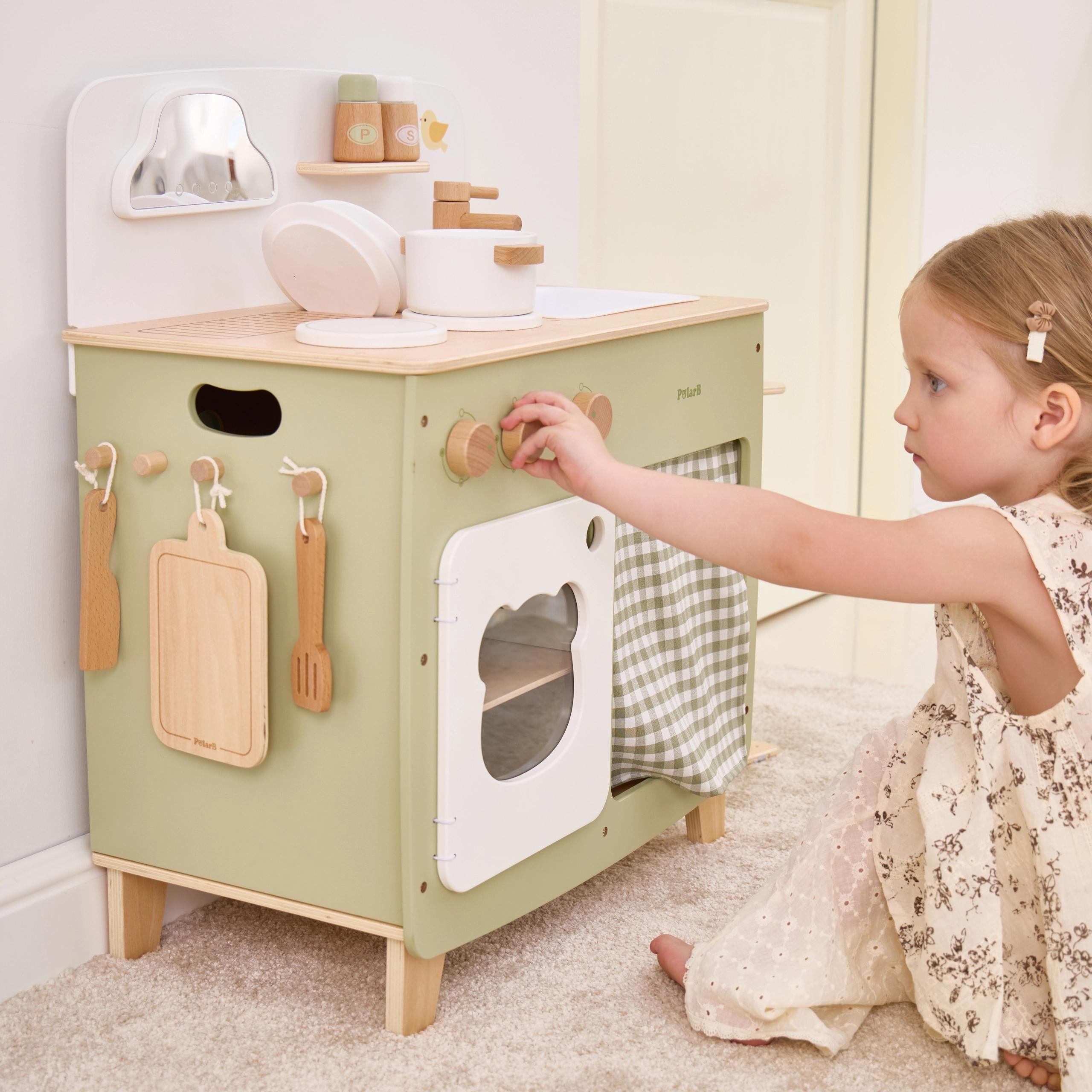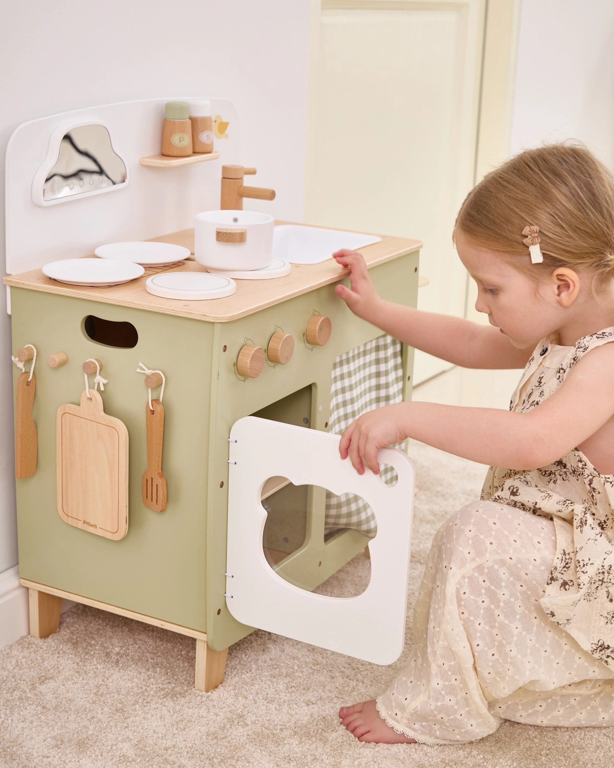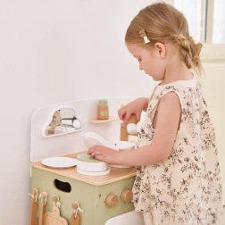 Stilīga bērnu virtuvīte patīkamās dabas un zaļos toņos piedāvā bērniem reālistisku gatavošanas pieredzi. Pateicoties izturīgajai koka konstrukcijai, grozāmajiem kloķiem, izlietnei un krāsnij, mazie pavāri baudīs stundām ilgas drošas un radošas rotaļas. Praktiskais nolokāmais sānu plaukts paplašina darba virsmu griešanai vai maltītei, savukārt skapītis ar aizkaru paslēps visus dārgumus.