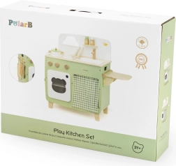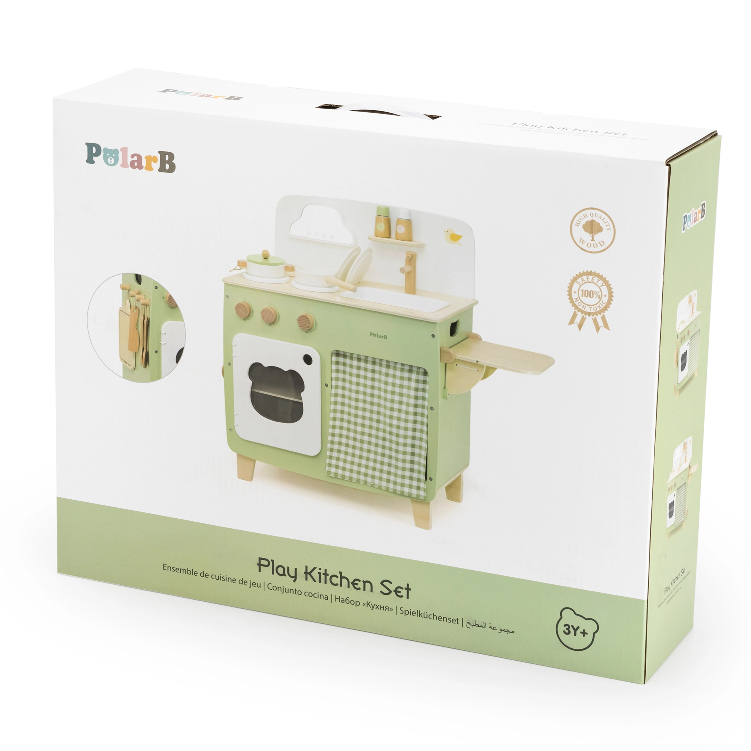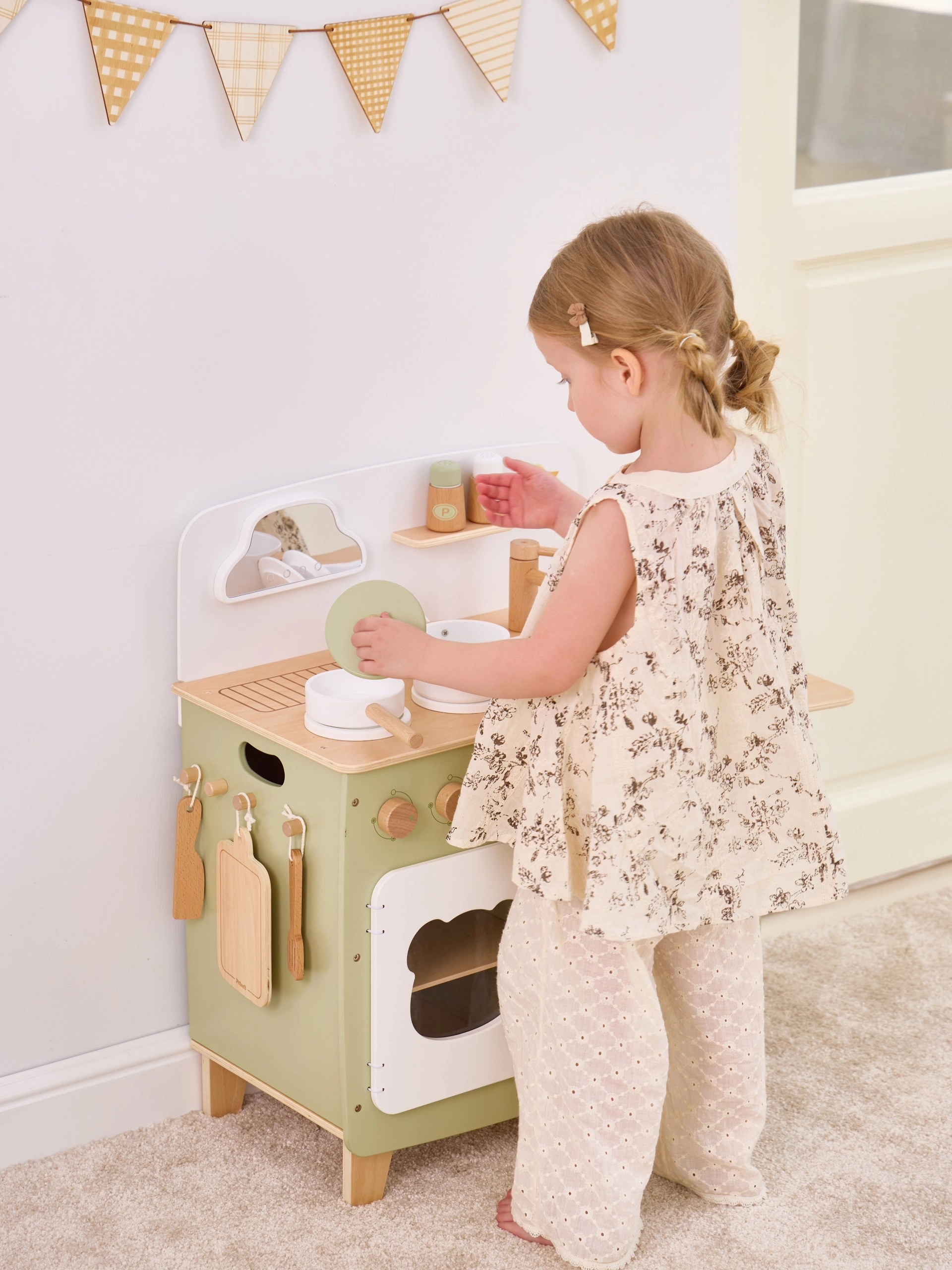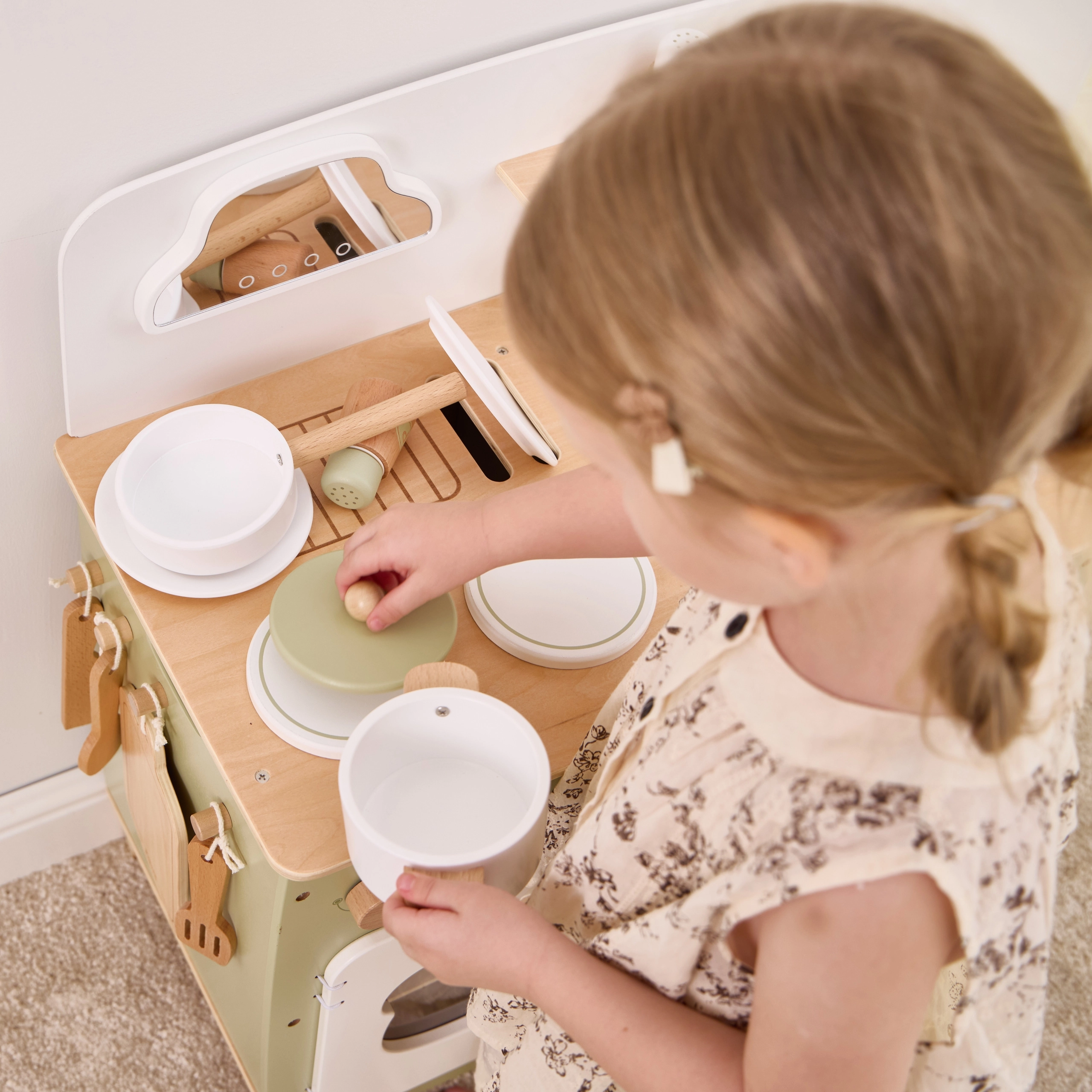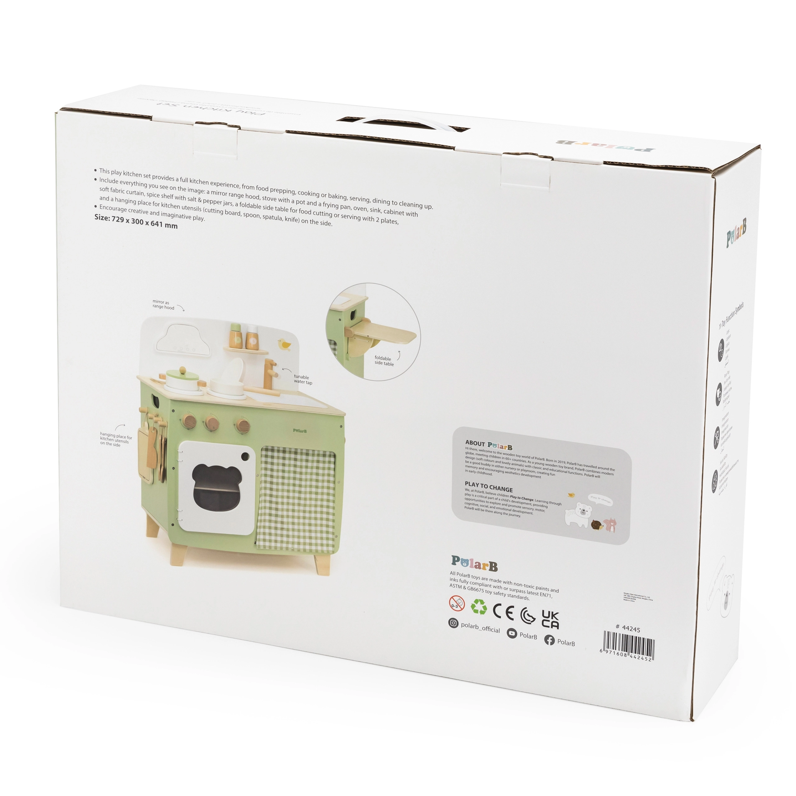 Stilīga bērnu virtuvīte patīkamās dabas un zaļos toņos piedāvā bērniem reālistisku gatavošanas pieredzi. Pateicoties izturīgajai koka konstrukcijai, grozāmajiem kloķiem, izlietnei un krāsnij, mazie pavāri baudīs stundām ilgas drošas un radošas rotaļas. Praktiskais nolokāmais sānu plaukts paplašina darba virsmu griešanai vai maltītei, savukārt skapītis ar aizkaru paslēps visus dārgumus.