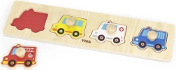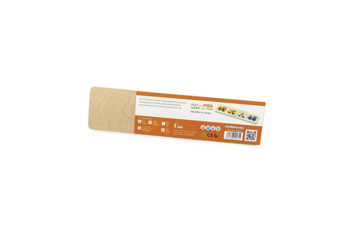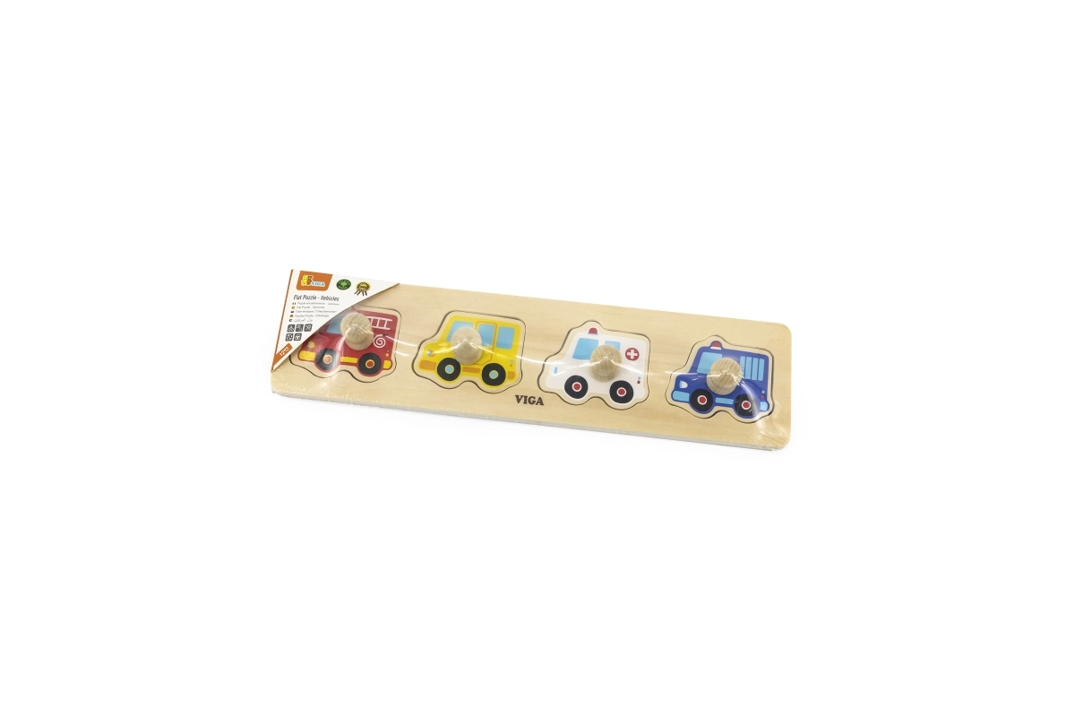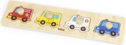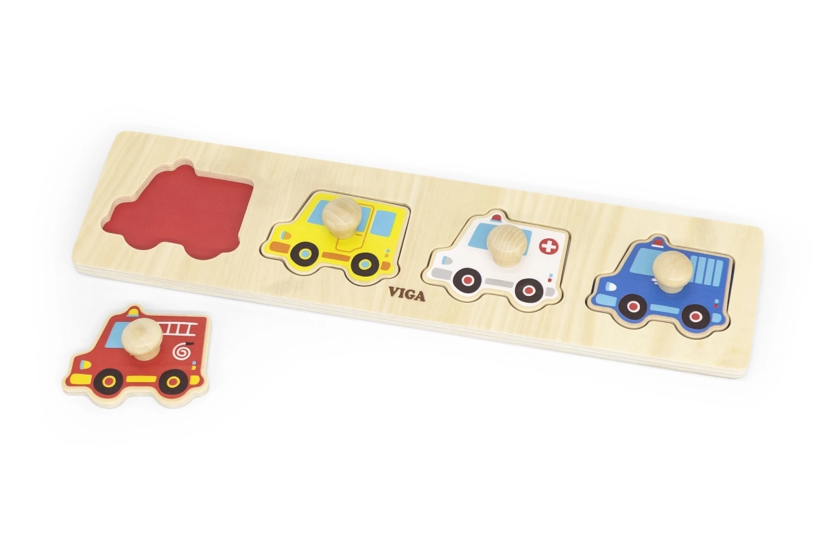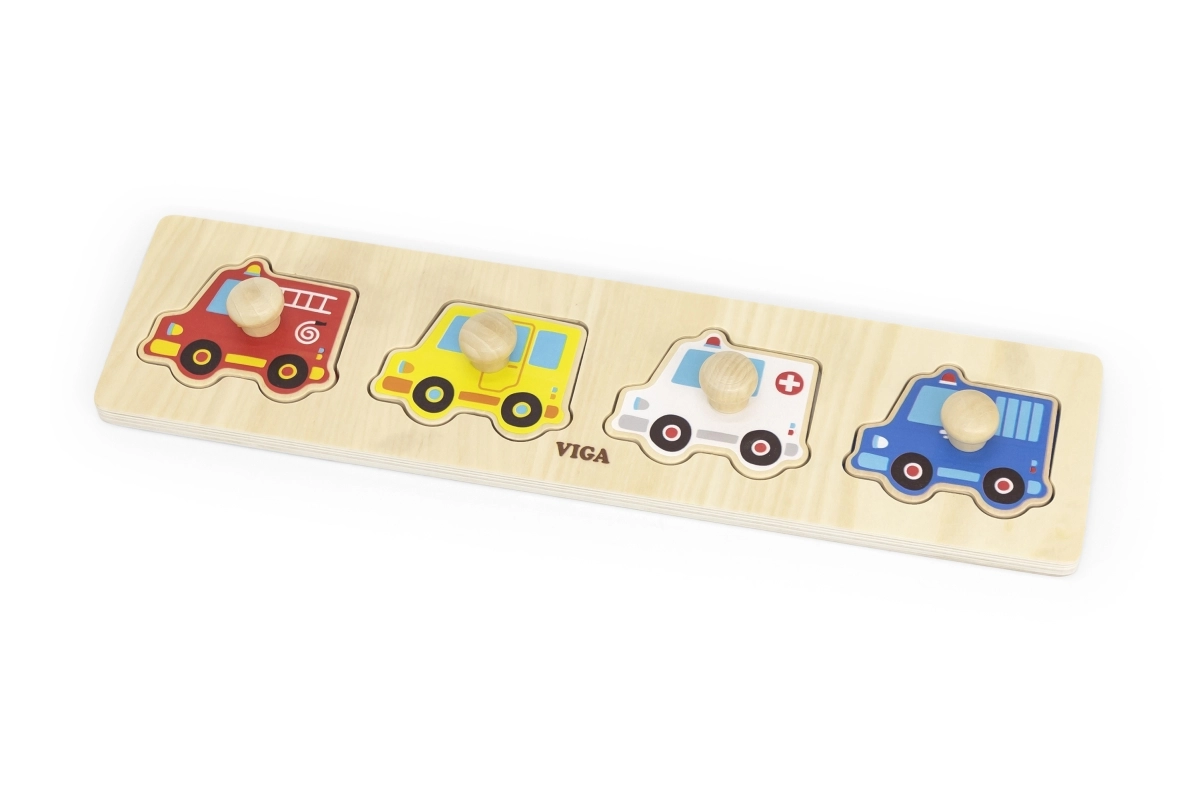 Šis kvalitatīvais koka ieliktnis ar četriem transportlīdzekļiem (ugunsdzēsēju auto, taksometrs, ātrā palīdzība un policijas auto) ir lieliska izvēle pirmajām loģiskajām spēlēm. Detaļas ar praktiskiem pogveida rokturiem atvieglo manipulāciju un iedrošina bērnus atkārtoti likt un atklāt.