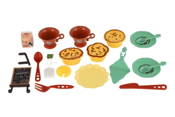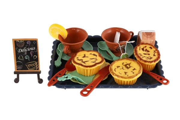 Krāsains bērnu tējas serviss ar paplāti ienes jautrību ikvienā bērnu virtuves spēlē. Komplektā ir tasītes, šķīvīši, galda piederumi un neliels deserts pilnvērtīgam tējas mielastam. Viegls un drošs plastmasas komplekts veicina gatavošanas rotaļas un bērnu sociālās prasmes no 3 gadu vecuma.