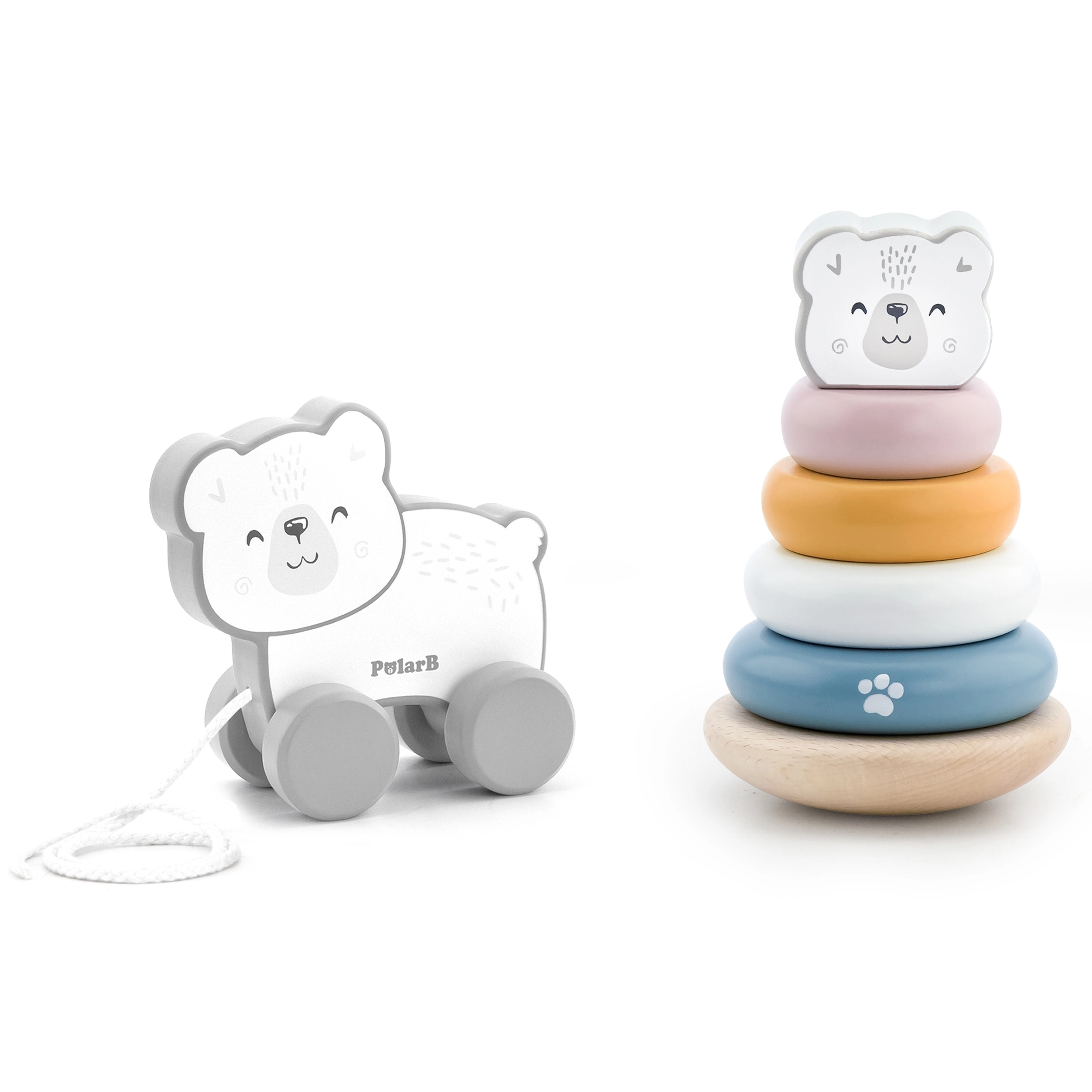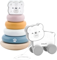 Stilīgs Viga zīmola PolarB kolekcijas komplekts piedāvā divas pasteļtoņu koka rotaļlietas: izglītojošu piramīdu ar polārlāci un mīlīgu velkamo lācīti. Attīsta sīko motoriku, loģisko domāšanu, roku–acu koordināciju un krāsu mācīšanos, vienlaikus nodrošinot ikdienas izklaidi.