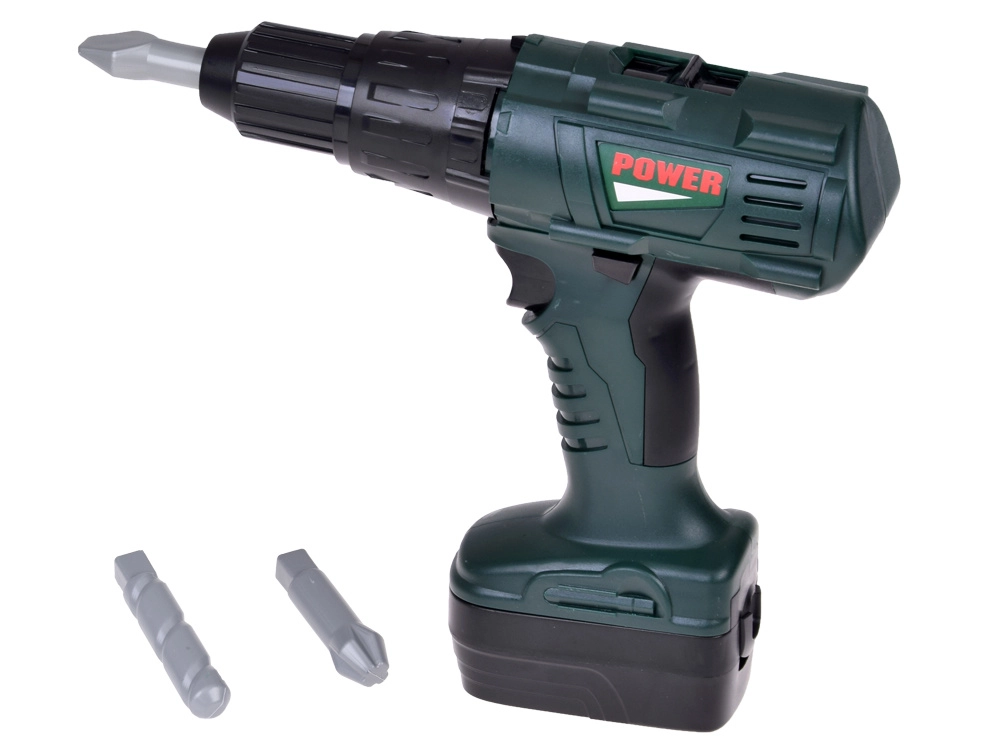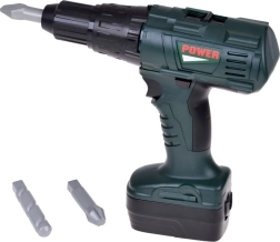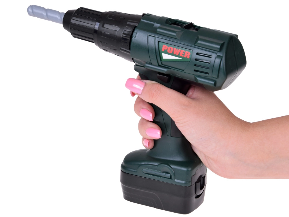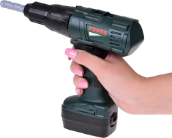 Vieglā plastmasas urbjmašīna ar 2× AA baterijām ļauj bērniem droši skrūvēt un trenēt koordināciju. Komplektā ir arī maināmi uzgaļi.