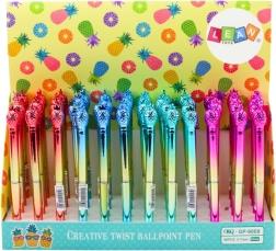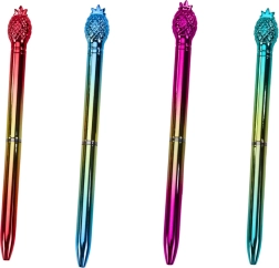 Stilīga lodīšu pildspalva ar zeltītu korpusu un dekoratīvu ananasu galā apvieno eleganci un funkcionalitāti. Raksta ar zilu tinti ar plūdenu padevi un 0,7 mm uzgaļa platumu, ideāli piemērota ikdienas piezīmēm un dāvanām. Pieejama zelta izpildījumā ar krāsu akcentiem: rozā, zilā, sarkanā, zaļā.