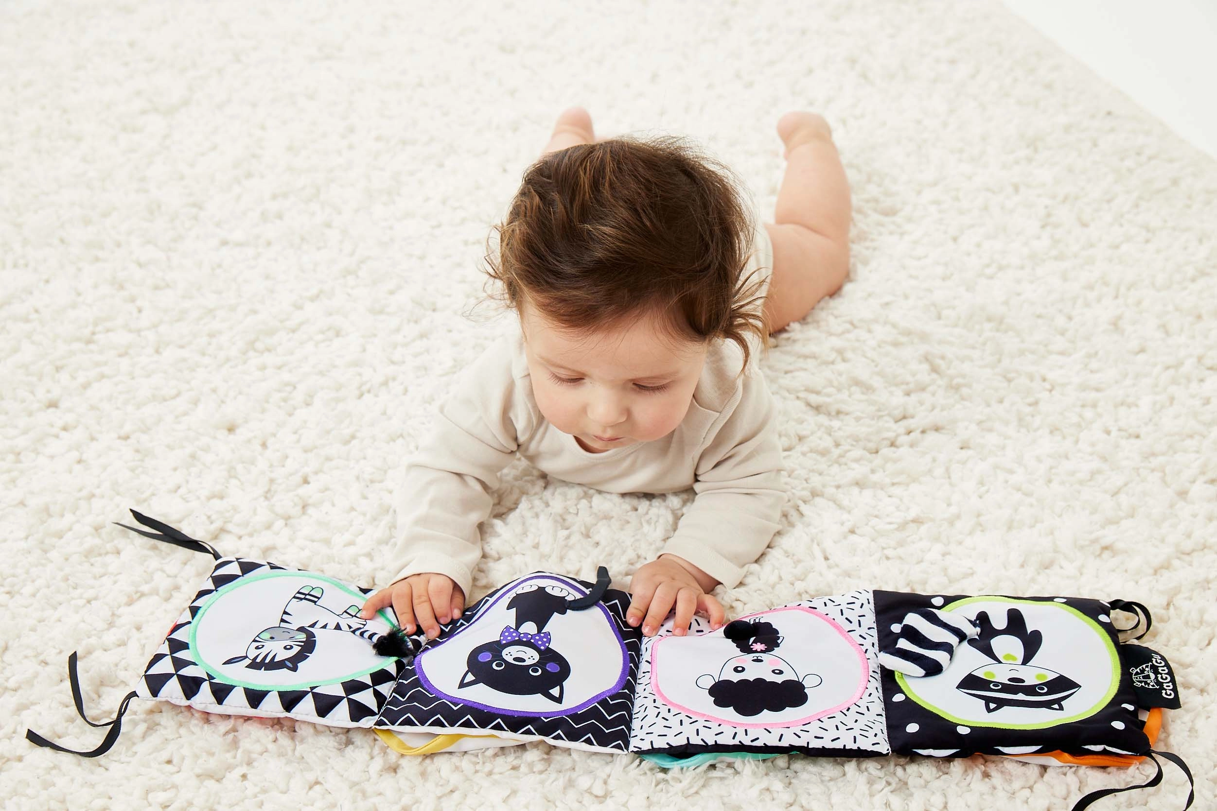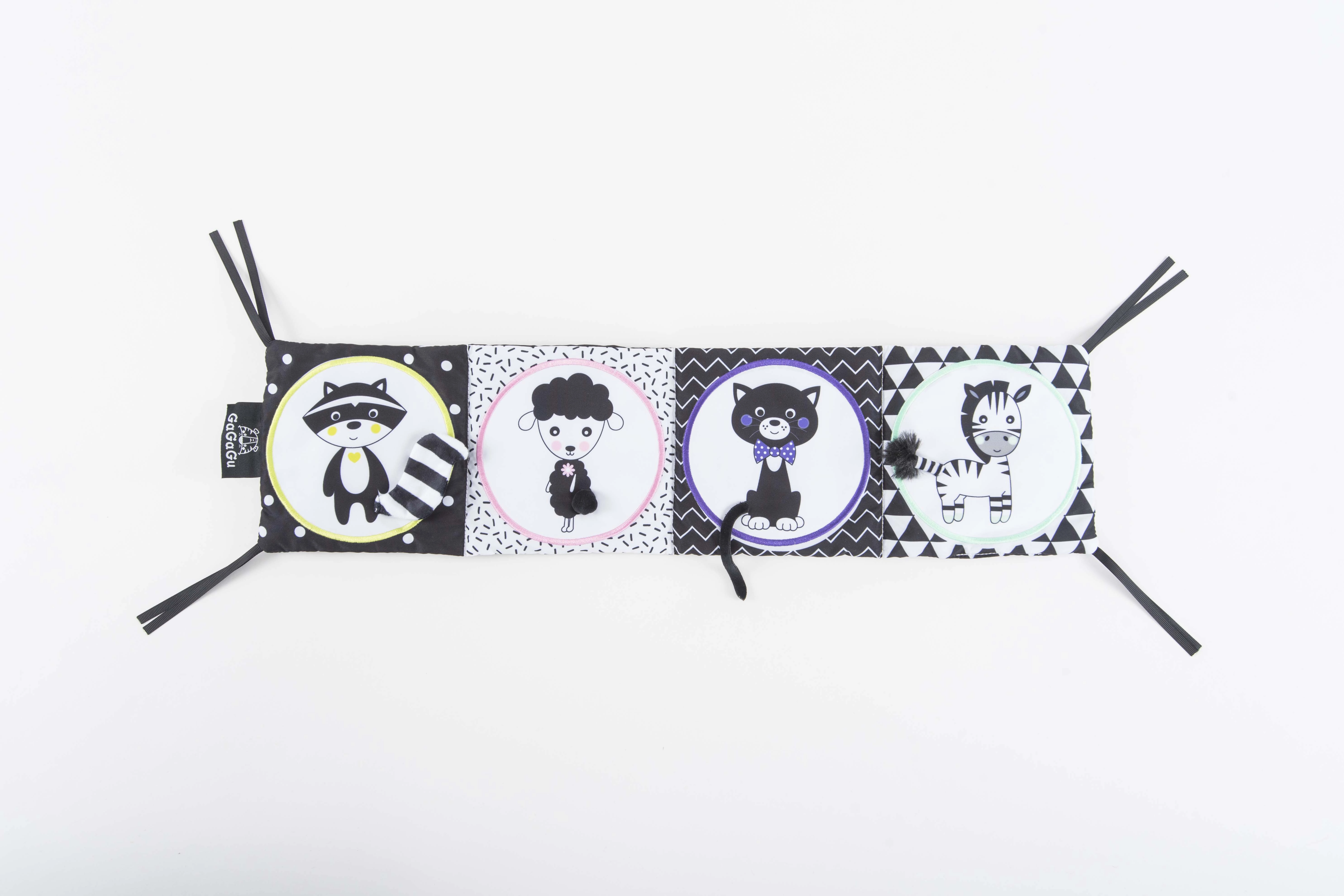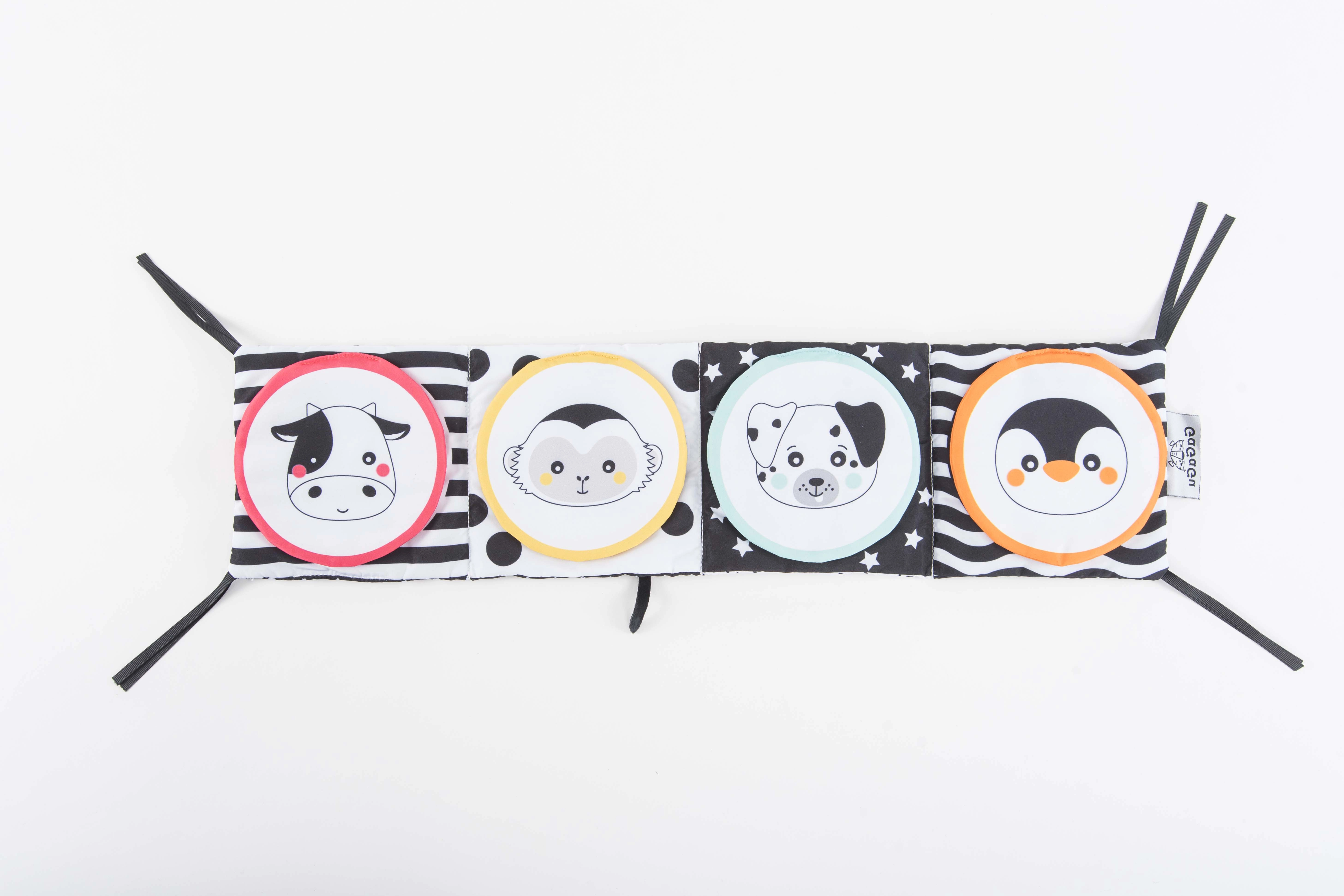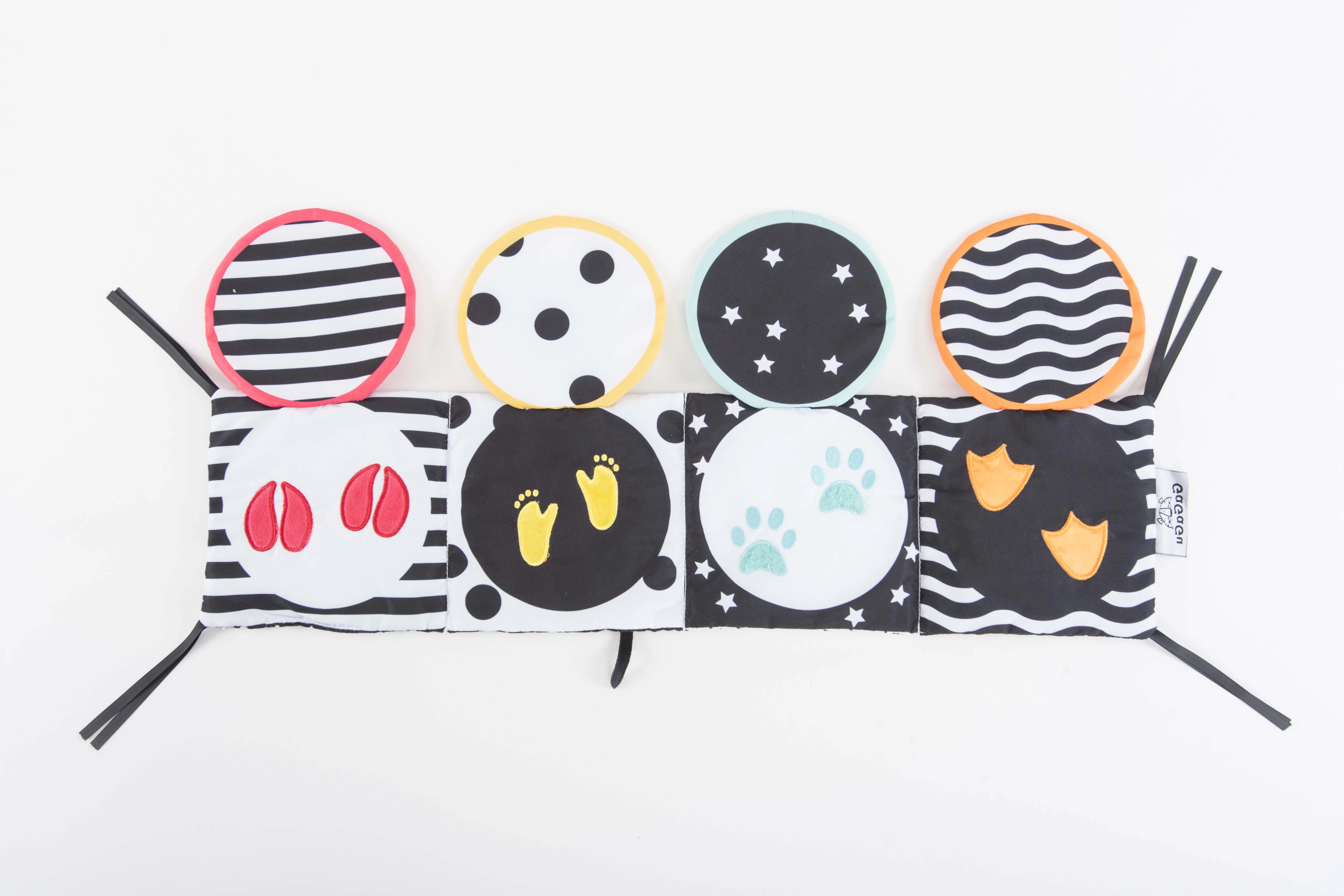 Divpusējā grāmatiņa piedāvā divas atšķirīgas vizuālās pieredzes ar izšūtiem elementiem un kontrastējošām dzīvnieku ilustrācijām. Pūkie atloki piešķir papildu izklaides dimensiju, čaukst pieskaroties un māca bērniem jaunus veidus un krāsas.