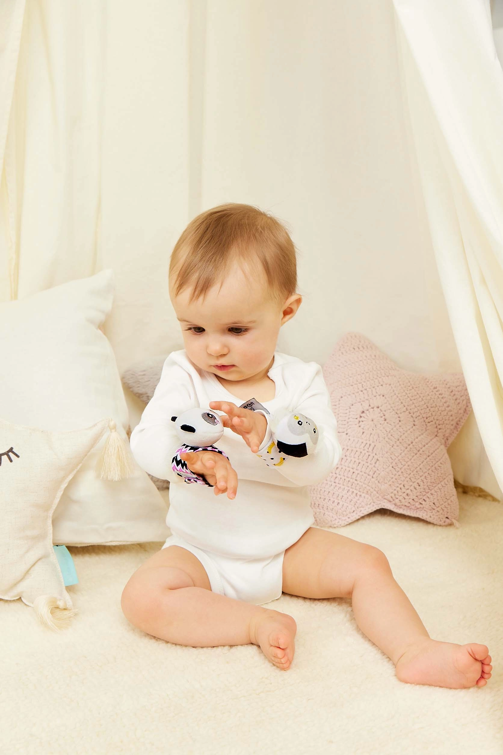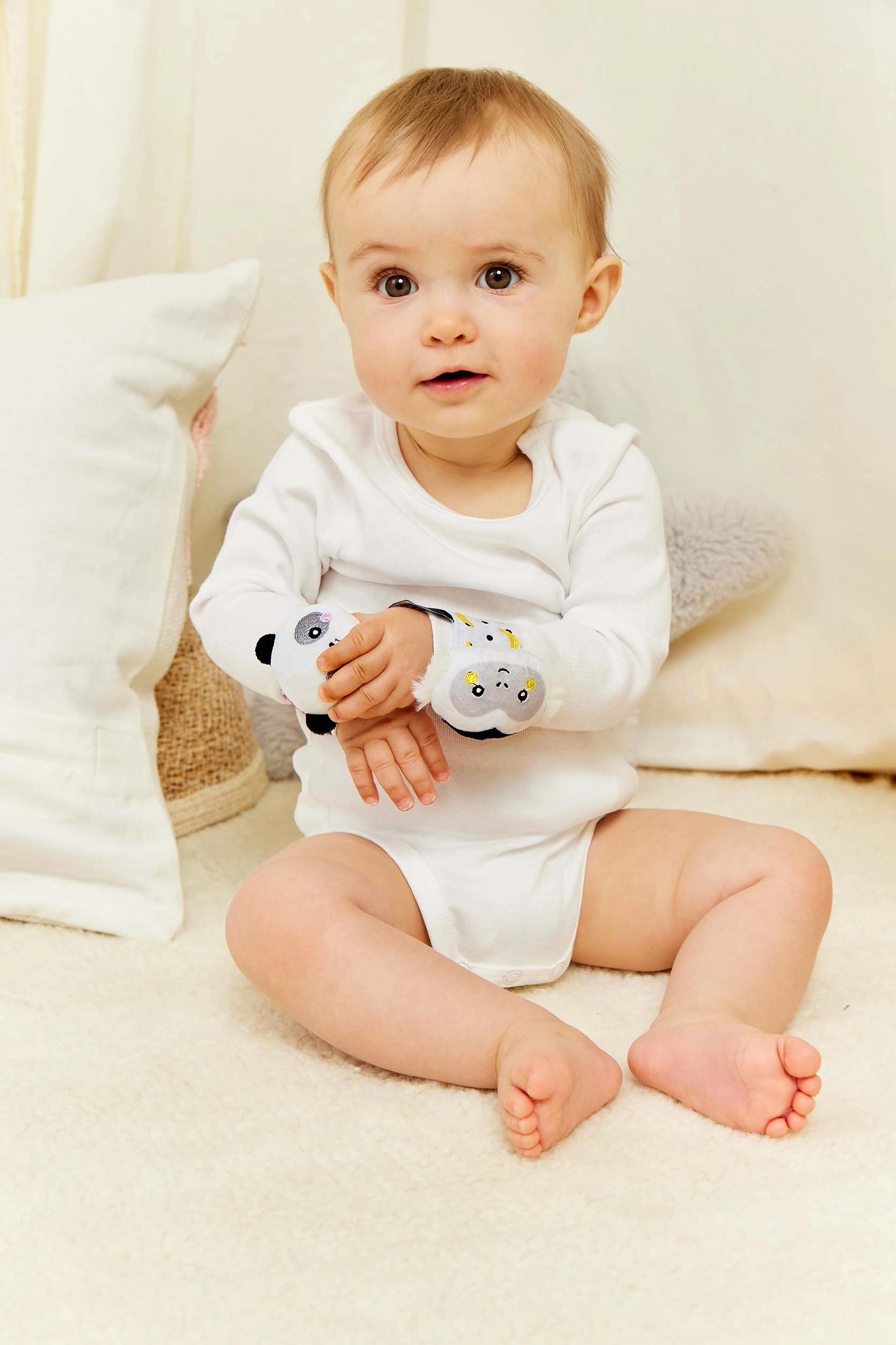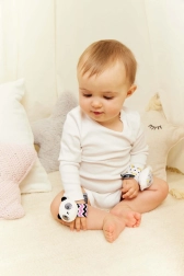 Vēl viena priekšrocība ir tā, ka grabuļi izmanto kontrastējošas krāsas un rakstus redzes stimulācijai un maigu skaņu dzirdes aktivizēšanai. Siksniņas materiāls ir veidots, lai tas būtu mīksts, nodrošinot ērtu nēsāšanu un vieglu satveršanu. Grabuli ir viegls un kompakts, ideāli piemērots pastaigām vai izbraucieniem.