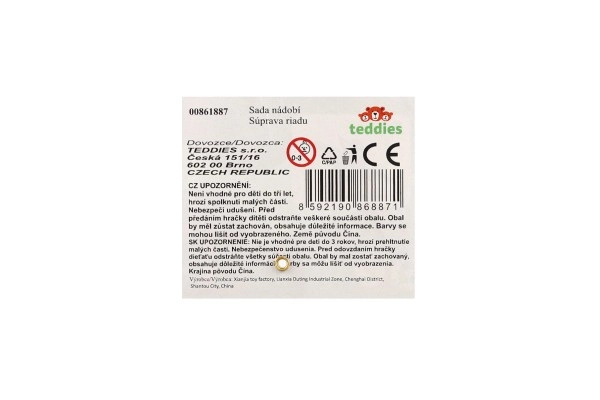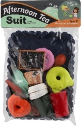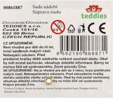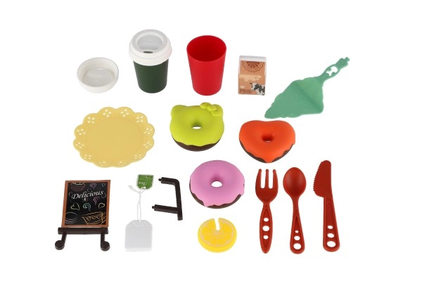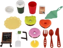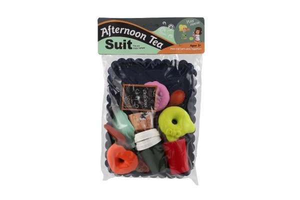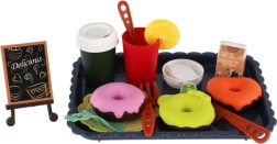Komplektā ietilpst dekoratīva zilā paplāte, kafijas krūzīte, neliela tējkanna, pudele/krūzīte, piena trauciņš, galda piederumi un dažādi saldie gardumi. Komplekts lieliski attīsta sociālās prasmes, komunikāciju un fantāziju, spēlējoties ar draugiem.