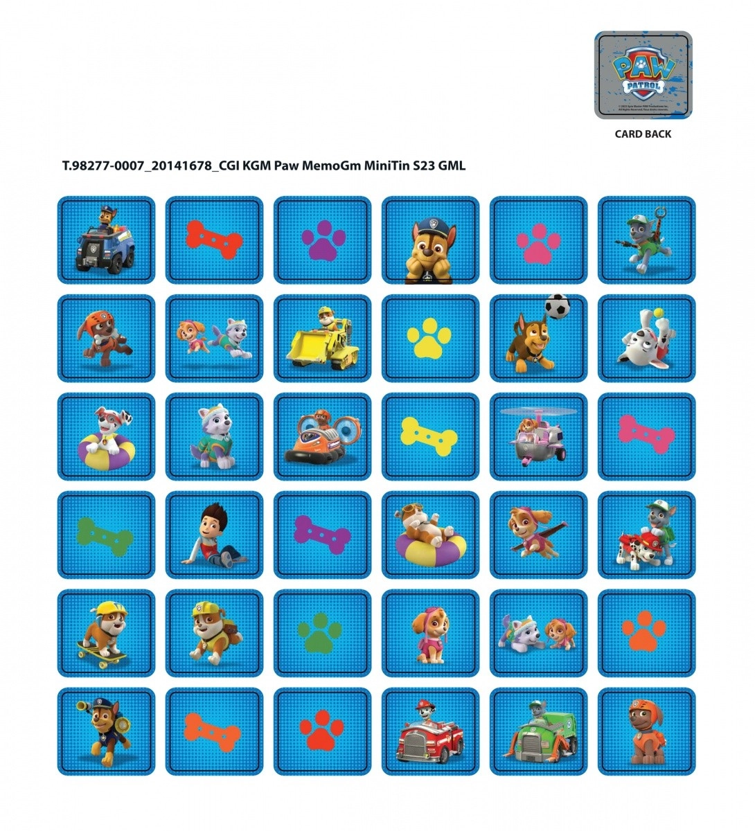 Atklājiet memo spēles burvību ar saviem iecienītākajiem varoņiem, piemēram, Chase, Skye, Marshall, Rubble un citiem. Spēlē ir 72 kartītes, kuras nepieciešams salikt pāros. Šī spēle ne tikai attīsta atmiņu un koncentrēšanos, bet arī sniedz daudz izklaides visai ģimenei.