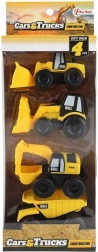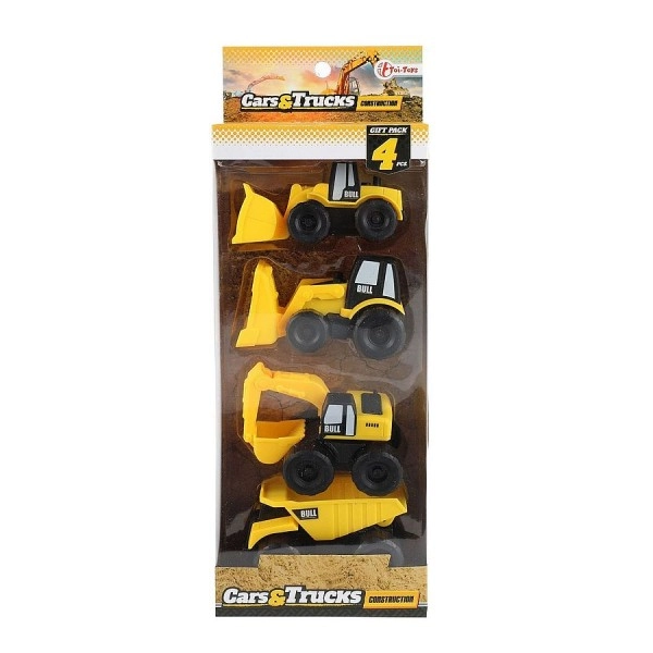 Komplektā ietilpst četri dažādi būvniecības transportlīdzekļi, kas veicina bērnu iztēles attīstību.