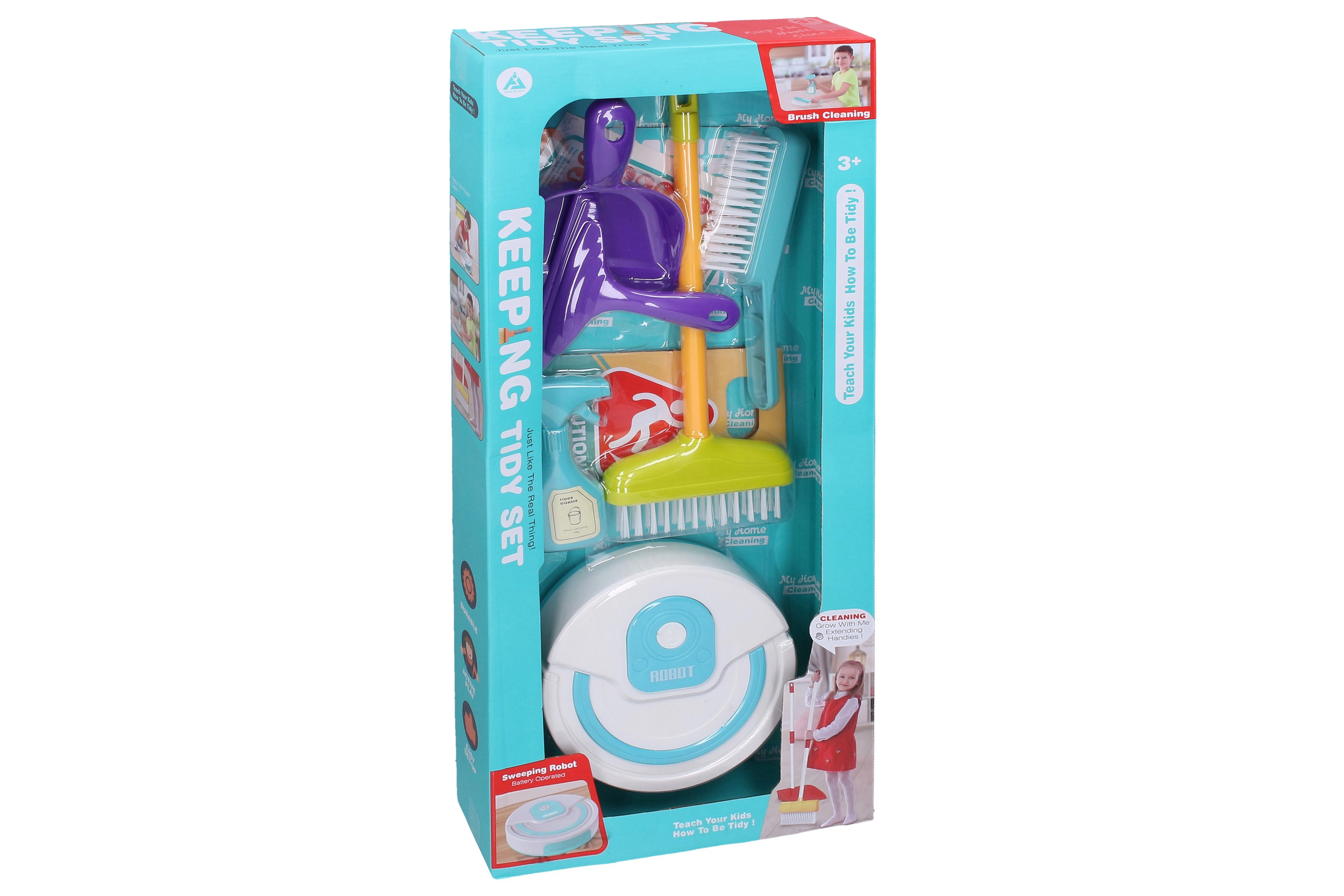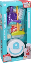 Izklaidējošs uzkopšanas komplekts bērniem, kas ietver visu nepieciešamo rotaļām uzkopšanas laikā – no robotu putekļsūcēja līdz brīdinājuma zīmei par slapju grīdu.
