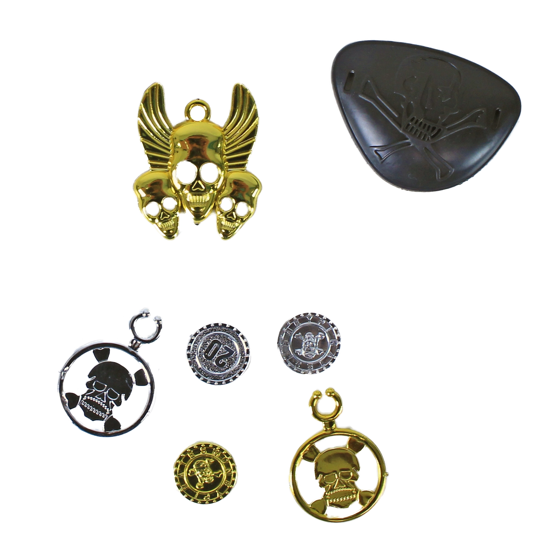 Komplektā iekļauti piekariņi un žetoni ar pirātu simboliem “metāliskā” izskatā vēl autentiskākai spēlei.