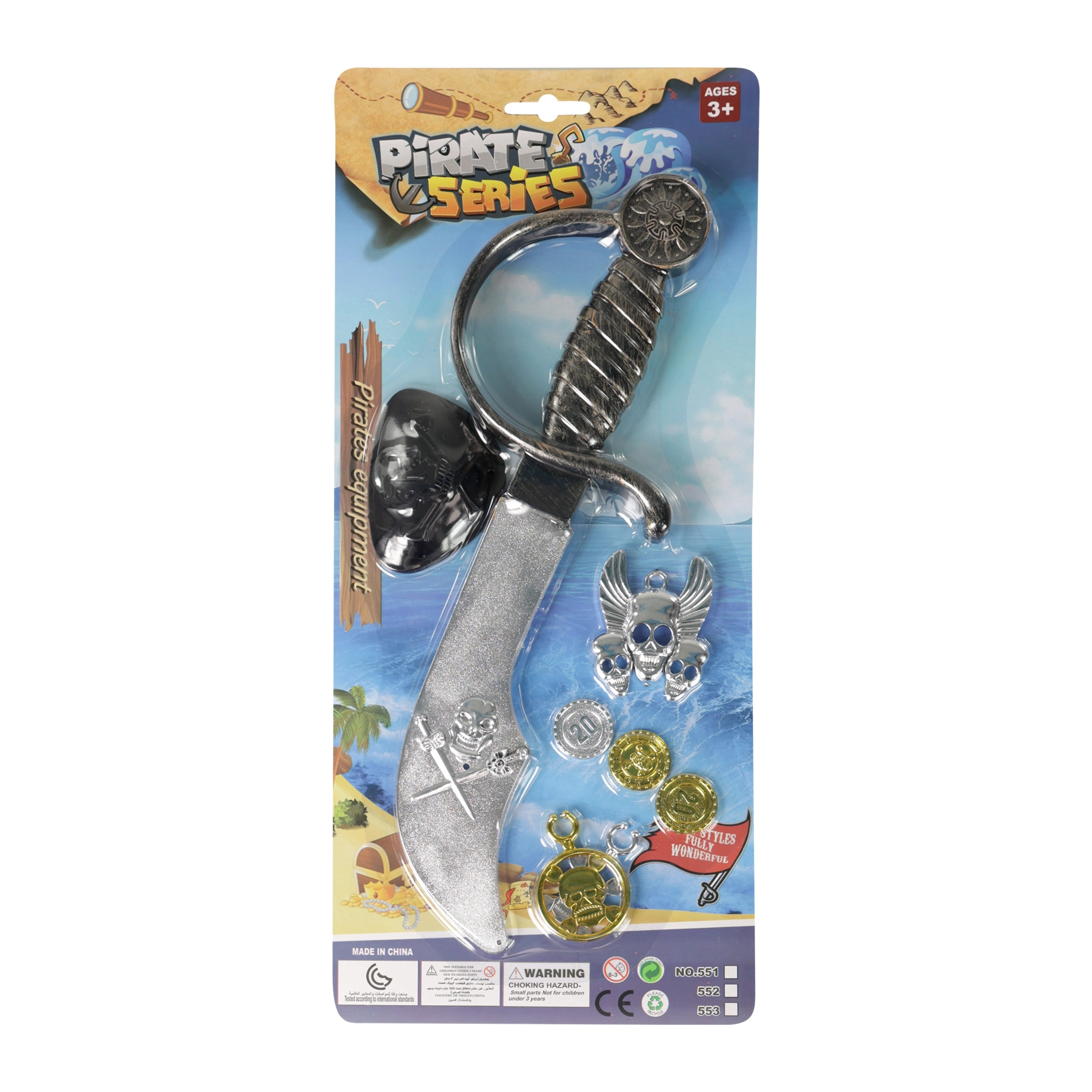 Šis pirātu komplekts pārvērtīs ikdienu piedzīvojumā. Bērniem patiks reālistiskais plastmasas zobens ar dekoratīvu rokturi un metāliski izskatīgo piekariņu un žetonu komplekts ar pirātu motīviem. Lieliska izvēle karnevālam, bērnu ballītēm un spēlēm mājās.