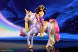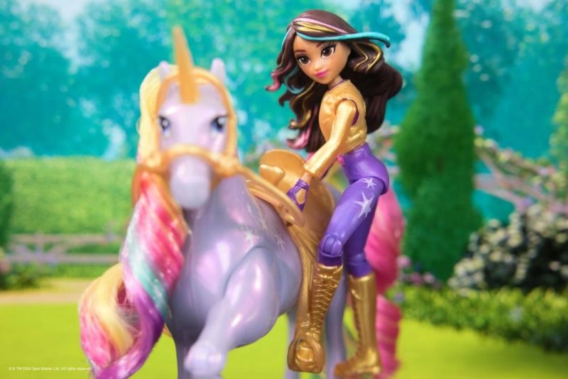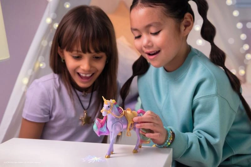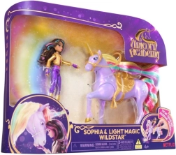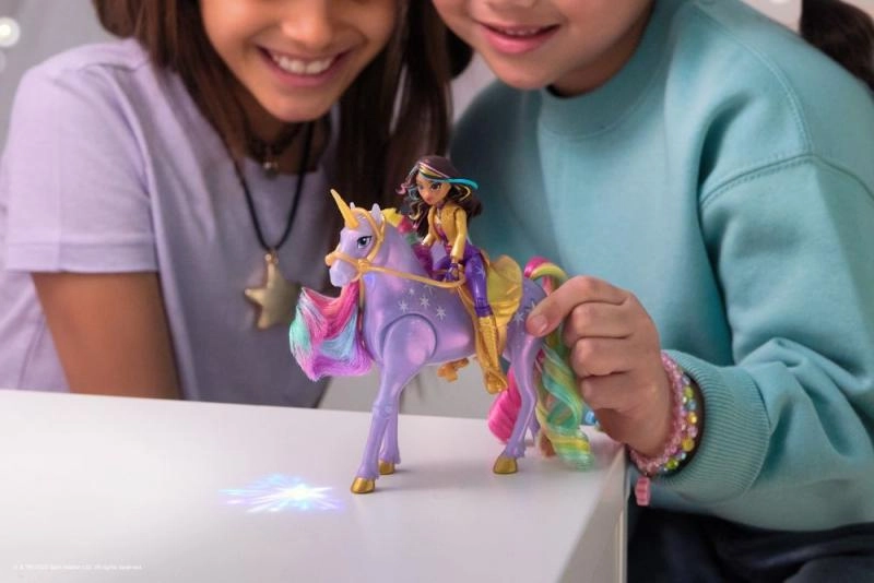 Atklājiet Vienradžu akadēmijas burvību ar pāri Sofija un vienradzis Vaildstar. Šis komplekts, iedvesmots no Netflix seriāla un grāmatu bestselleriem, piedāvā mirdzošus gaismas efektus, mīkstu varavīksnes krēpi un asti un pārvietojamu lelli ērtai pozēšanai seglos. Nospiediet zvaigznes formas pogu un vērojiet, kā Vaildstar “minas” un projicē varavīksnes rakstu – tieši kā stāstā.