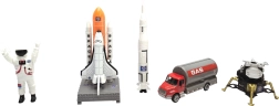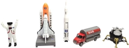 - Kosmonauta figūriņa, raķete, raķešplāns uz palaišanas rampas, mēness modulis, cisternas kravas auto