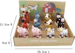 Atklājiet lauksaimniecības burvību ar šiem lieliskajiem koka spiežamajiem dzīvnieciņiem. Katrs dzīvnieciņš — vai tas būtu ēzelis, zirgs, govs, cūka, aita vai suns — ir izgatavots ar precizitāti un mīlestību pret koku. Bērni var izvēlēties no sešām versijām, kas ļauj aizraujošām un radošām spēlēm.