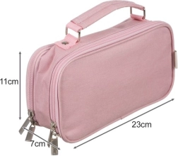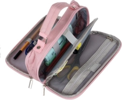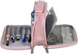 Pirmajā daļā atradīsiet divas kameras, ko atdala atloks ar lipekli (velkro), lielu sietiņkabatu uz atlokā, mazāku tekstila kabatiņu un vēl vienu sietiņkabatu ar rāvējslēdzēju. Iekšpusē ir arī elastīgās gumijas cilpas piederumu fiksēšanai. Otrā daļa piedāvā divas mazākas sietiņkabatas un piecus sietiņturētājus pildspalvām, zīmuļiem vai flomāsteriem – viss pārskatāmi un pa rokai.