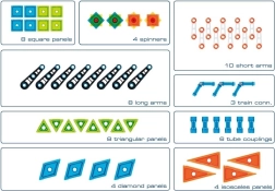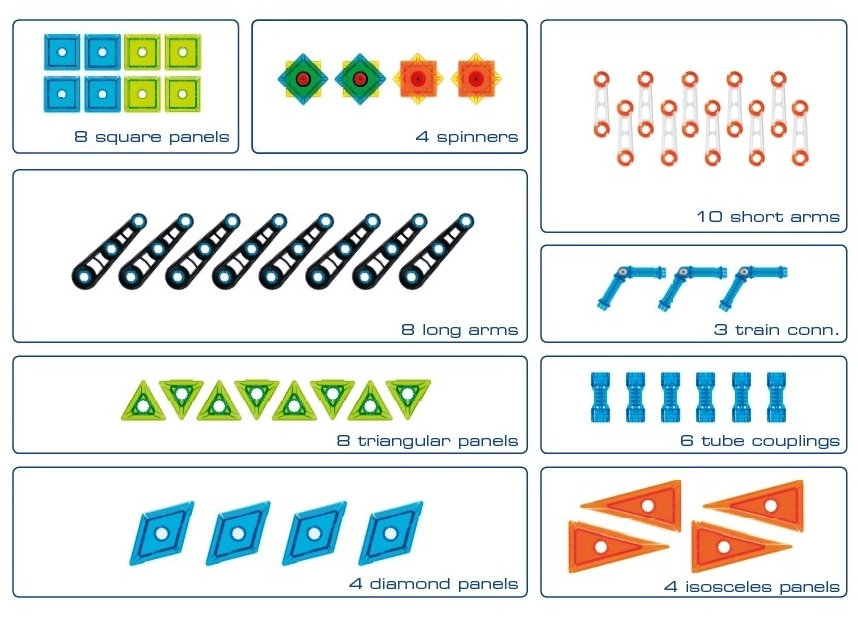 - 73 radošie komponenti, piemēram, riteņi, spineri un stieņi