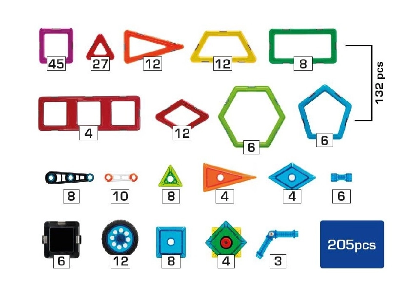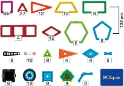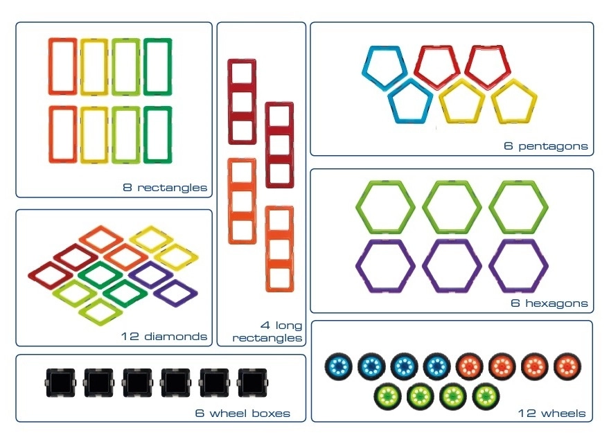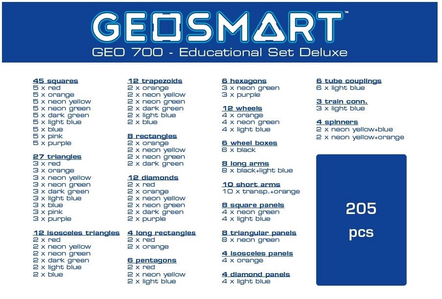 Iekļauts detalizēts sastāva apraksts un iedvesmojošas lapas. GeoSmart produkti nav savietojami ar citu zīmolu magnētiskajiem konstruktoriem.