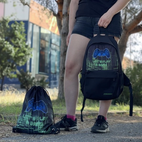 Stilīga skolas mugursoma spēlētājiem KRUZZEL apvieno izturību, komfortu un gudru organizāciju. Tā ir izgatavota no OXFORD 600D auduma, piedāvā 22 l tilpumu, ergonomiskas siksnas ar EPE putām un elpojošu muguras daļu. Ir polsterēta kabata klēpjdatoram, sānu tīkla kabatas, un komplektā atradīsiet arī sporta vai maiņas apavu maisiņu ar to pašu spēļu dizainu.