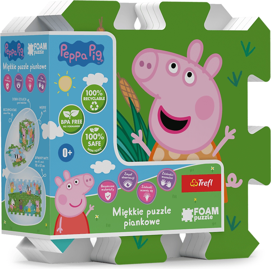 Putu puzle ar Peppa Cūciņas motīvu piedāvā bērniem drošu un aizraujošu spēļu laukumu. Speciāls daudzslāņu materiāls atgādina biezu paklājiņu, ir patīkami mīksts, slāpē triecienus un pasargā no grīdas aukstuma. Daļas ir viegli kopjamas – pēc spēlēšanās pietiek tās noslaucīt ar mitru lupatiņu.