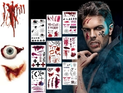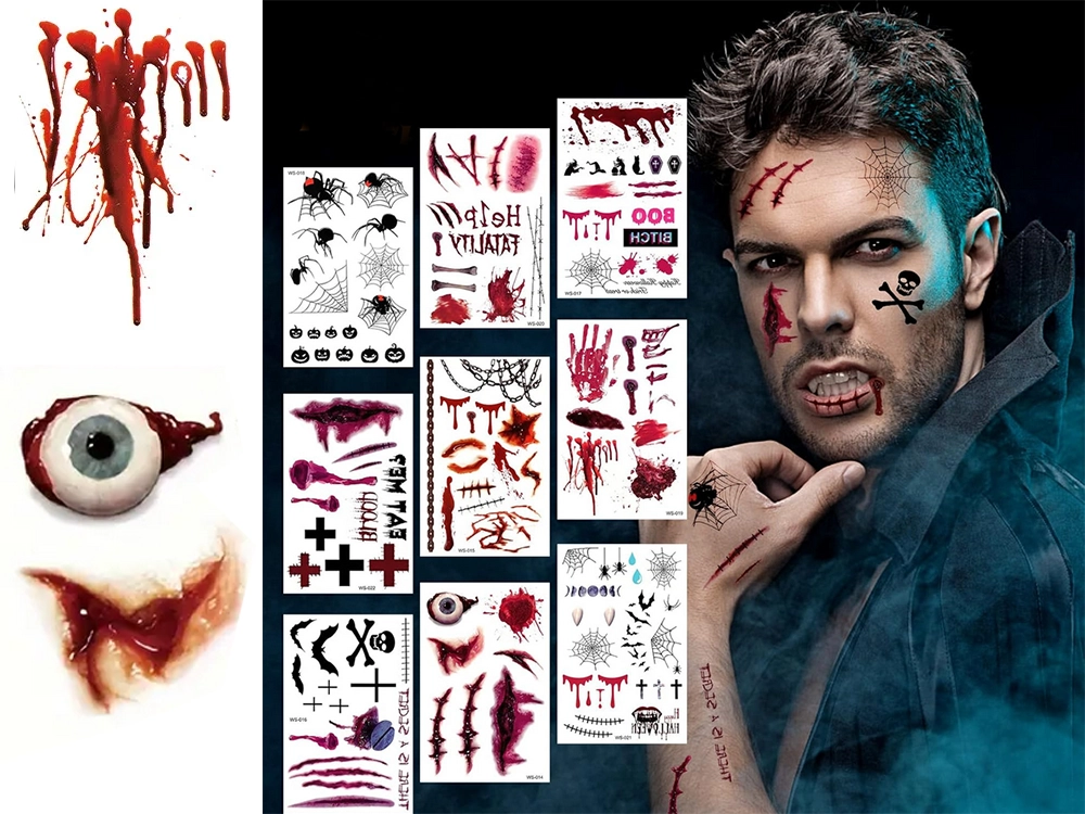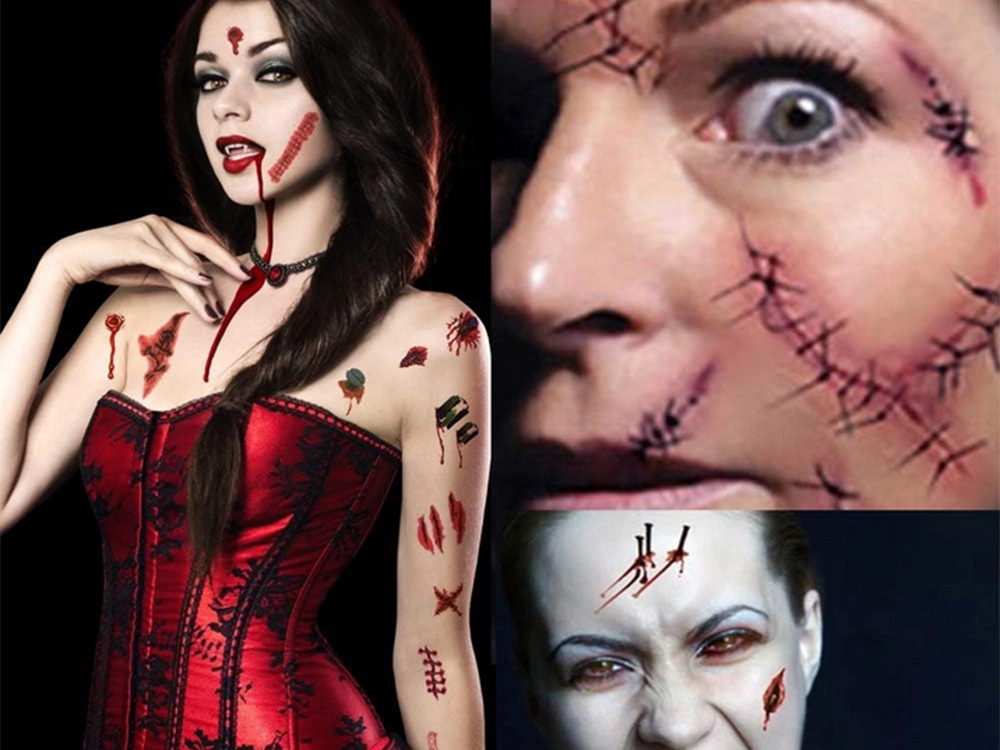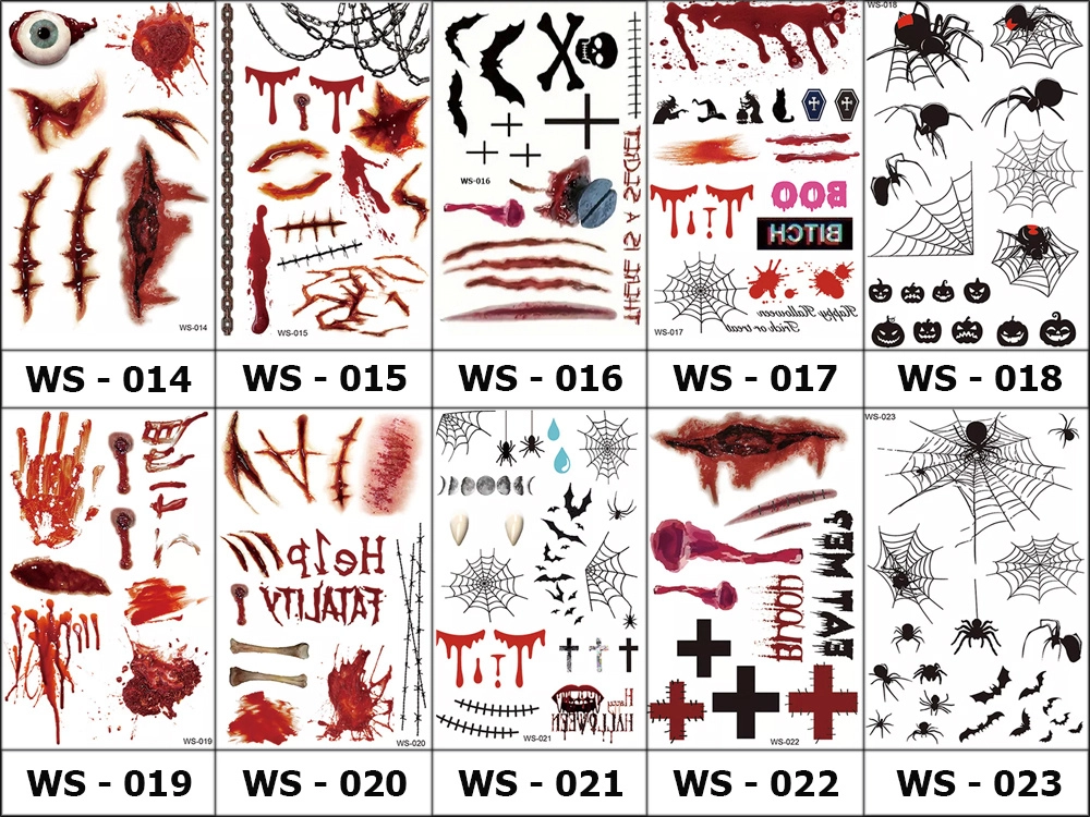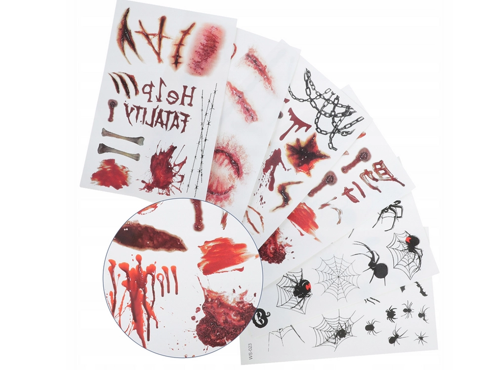 Pateicoties plašajam motīvu klāstam, viegli pieskaņosiet grimu Helovīnam, tematiskiem vakariem un fotosesijām. Katra lapa piedāvā šausminošu dizainu miksu no asiņainiem šļakstiem un zirnekļu tīkliem līdz pat dziļām rētām – maksimāli reālistiskam efektam.