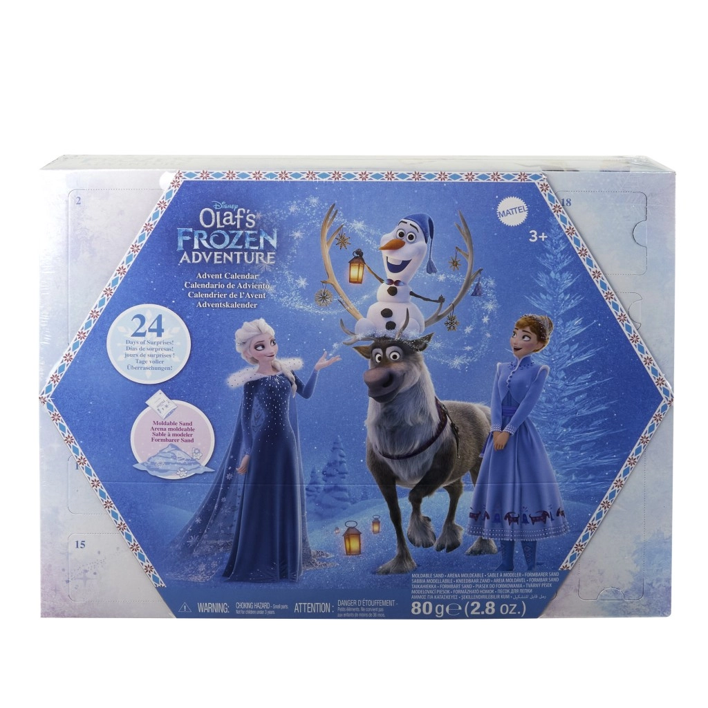 Atklāj 24 dienas prieka ar adventes kalendāru, iedvesmotu no īsfilmas “Olafa piedzīvojumi”. Katru dienu bērnus gaida jauns pārsteigums – sākot ar kustīgajām Annas un Elzas lellēm ar maināmām svārciņām un beidzot ar iemīļotajiem draugiem Olafu un Svēnu. Annas ceļgalu locītavas ļauj ērti “jādelēt” uz Svēna un sniedz vēl vairāk jautrības sniegotajās ainās.