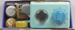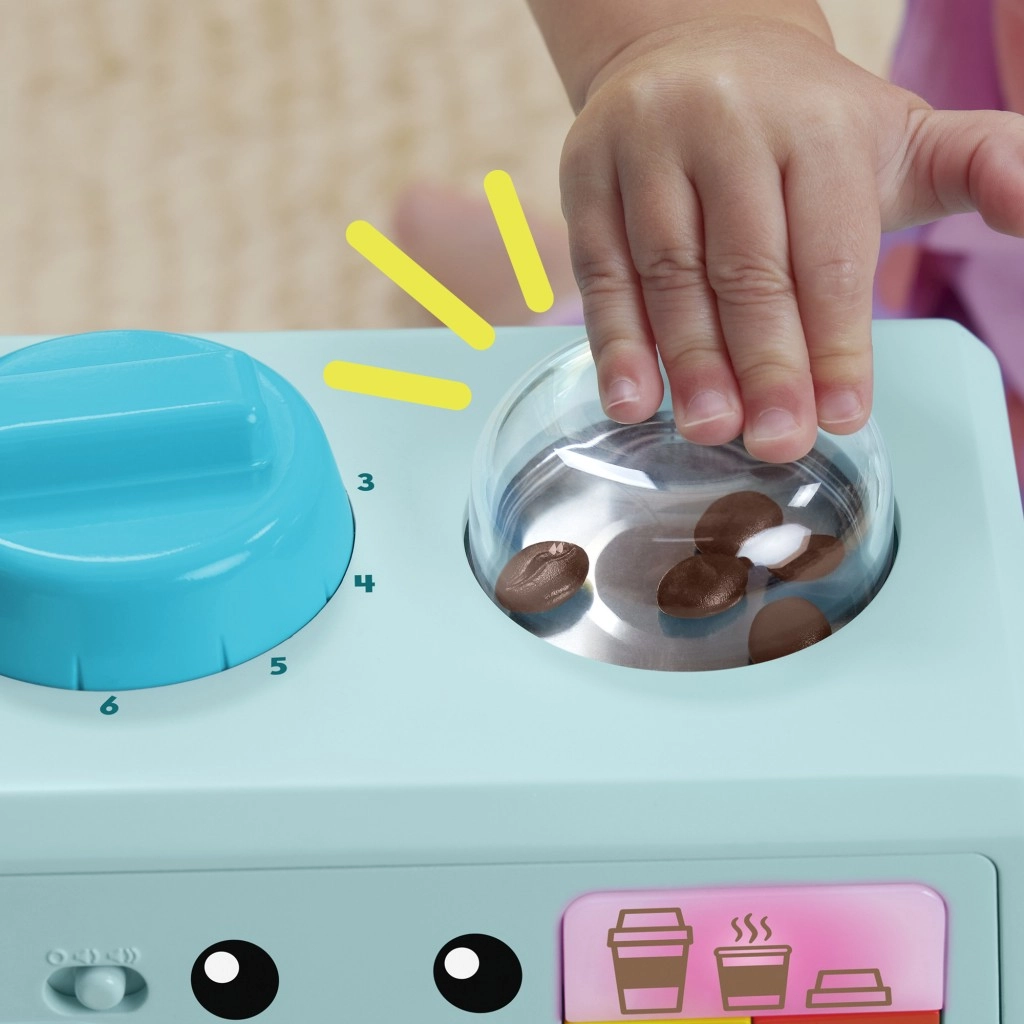 Bērni var nospiest pogas, lai simulētu kafijas pagatavošanu, griezt ritenīti putošanai vai kustināt kafijas dzirnaviņas, lai redzētu, kā uzlec kafijas pupiņas. Komplektā ir arī rotaļu piederumi: divas kafijas glāzītes, karotīte, kruasāns, mīksta preču somiņa ar vāciņu, piena glāzīte un nēsāšanas paliktnis.