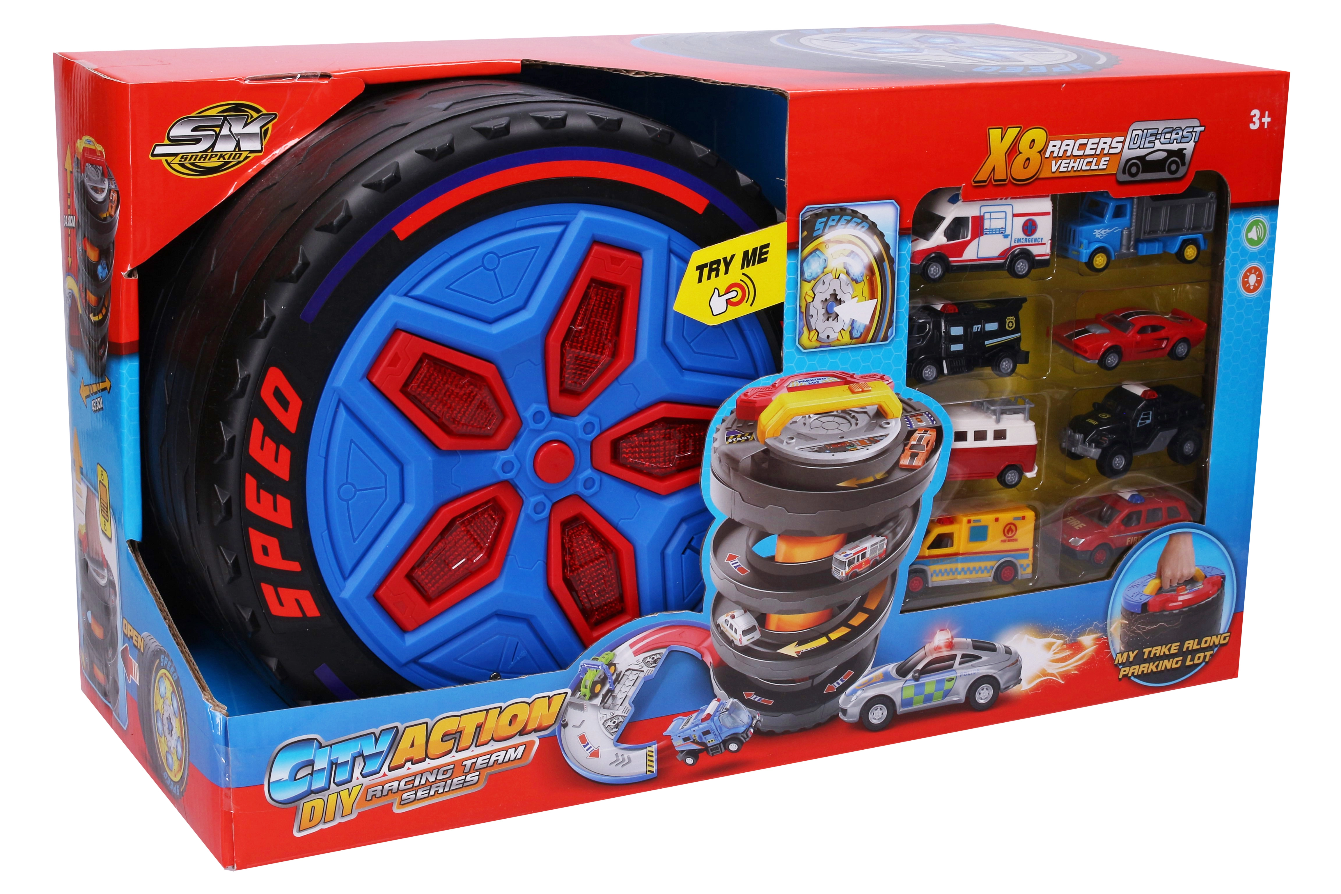 Izbaudiet dinamiskas sacīkstes jebkur ar šo pārnēsājamo sacīkšu staciju riteņa formā. Komplektā ir 8 detalizēti auto ar metāla šasiju un brīvgaitas riteņiem, gaismas un skaņas efekti, ko aktivizē poga, kā arī bloķēšanas slēdzis ērtai trases atvēršanai. Baterijas 3× AG13 ir iekļautas komplektā.