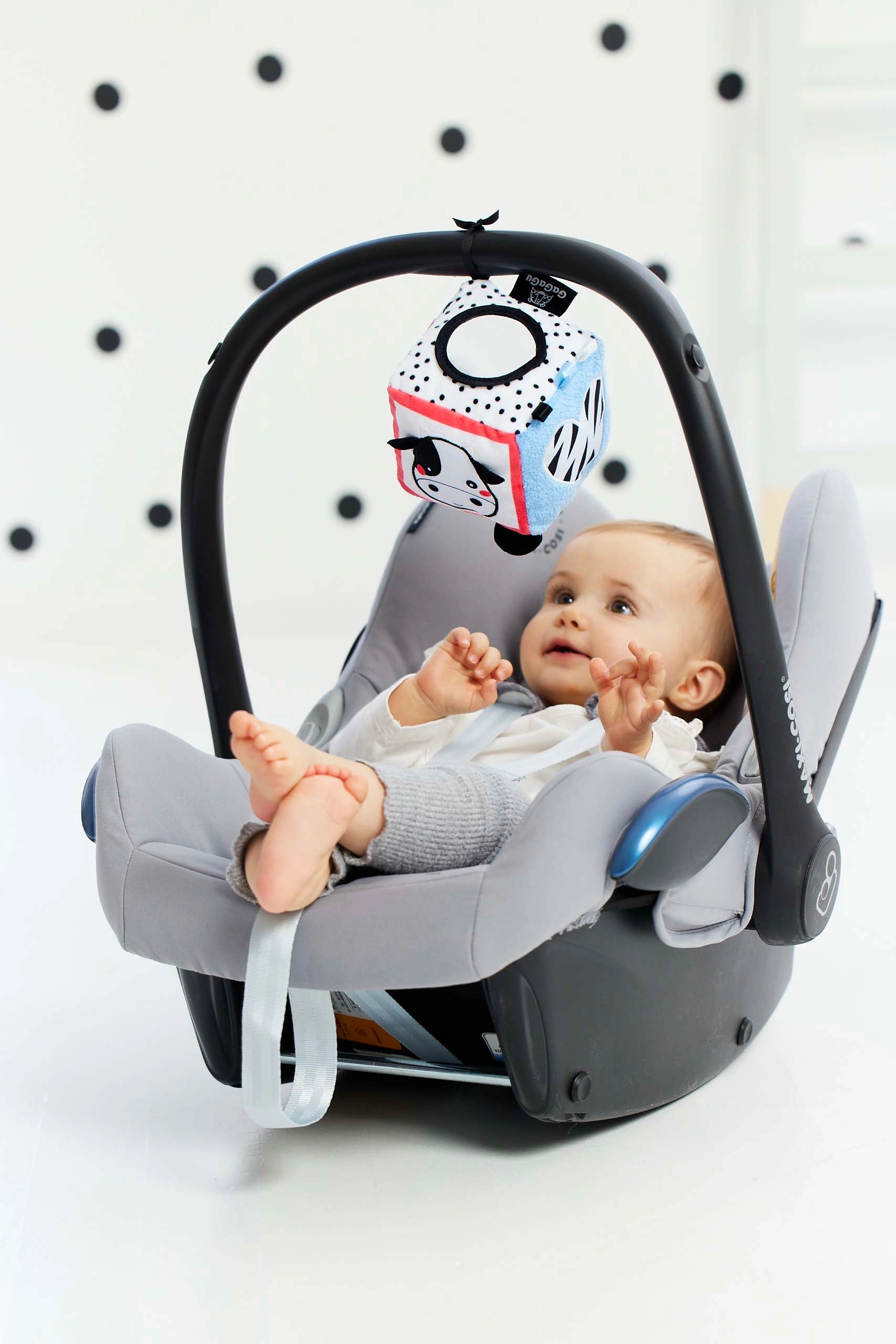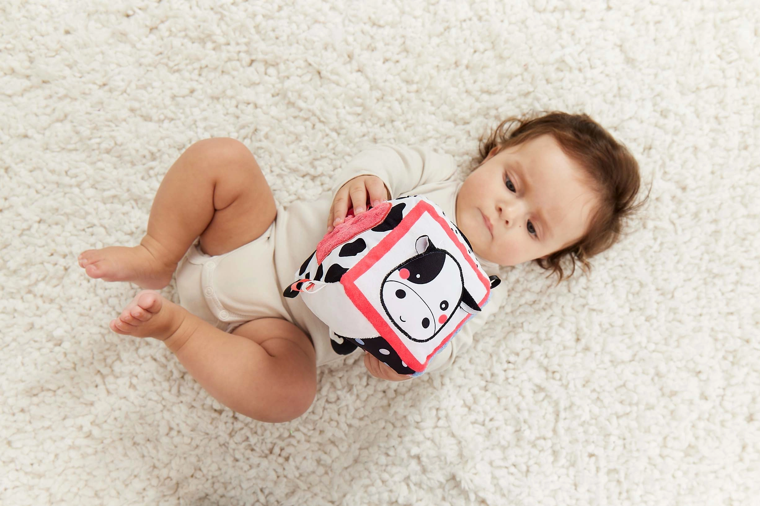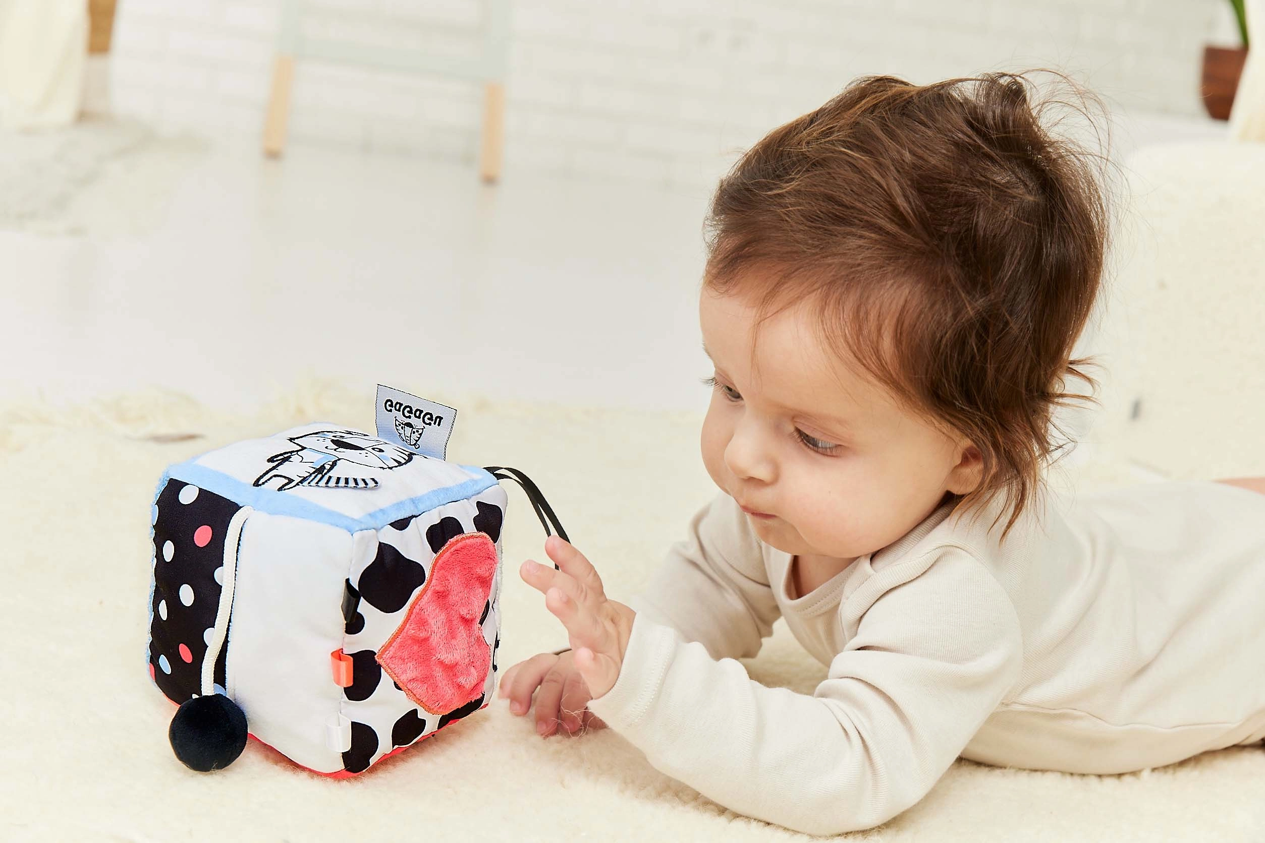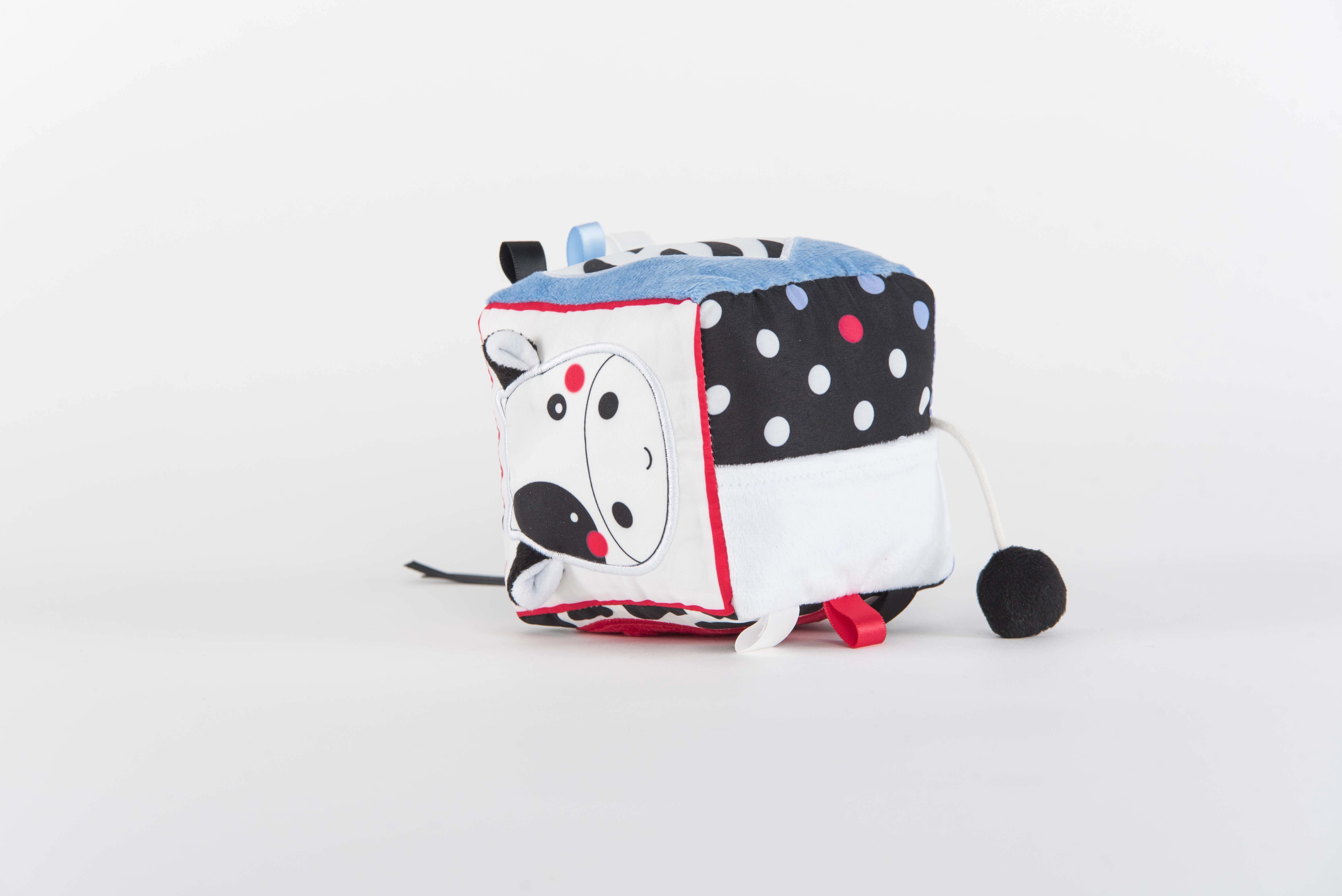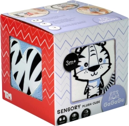 Šis mīkstais sensorais kubs ir radīts pašiem mazākajiem izzinātājiem. Katra no sešām pusēm sniedz atšķirīgu maņu pieredzi – no kontrastainiem melnbaltiem rakstiem ar krāsainiem akcentiem līdz daudzveidīgām tekstīlijām un virsmām, kas aicina pieskarties un atklāt. Mīlīgie govs un tīģera motīvi rosina ziņkāri un māca bērnam uztvert formas un emocijas.