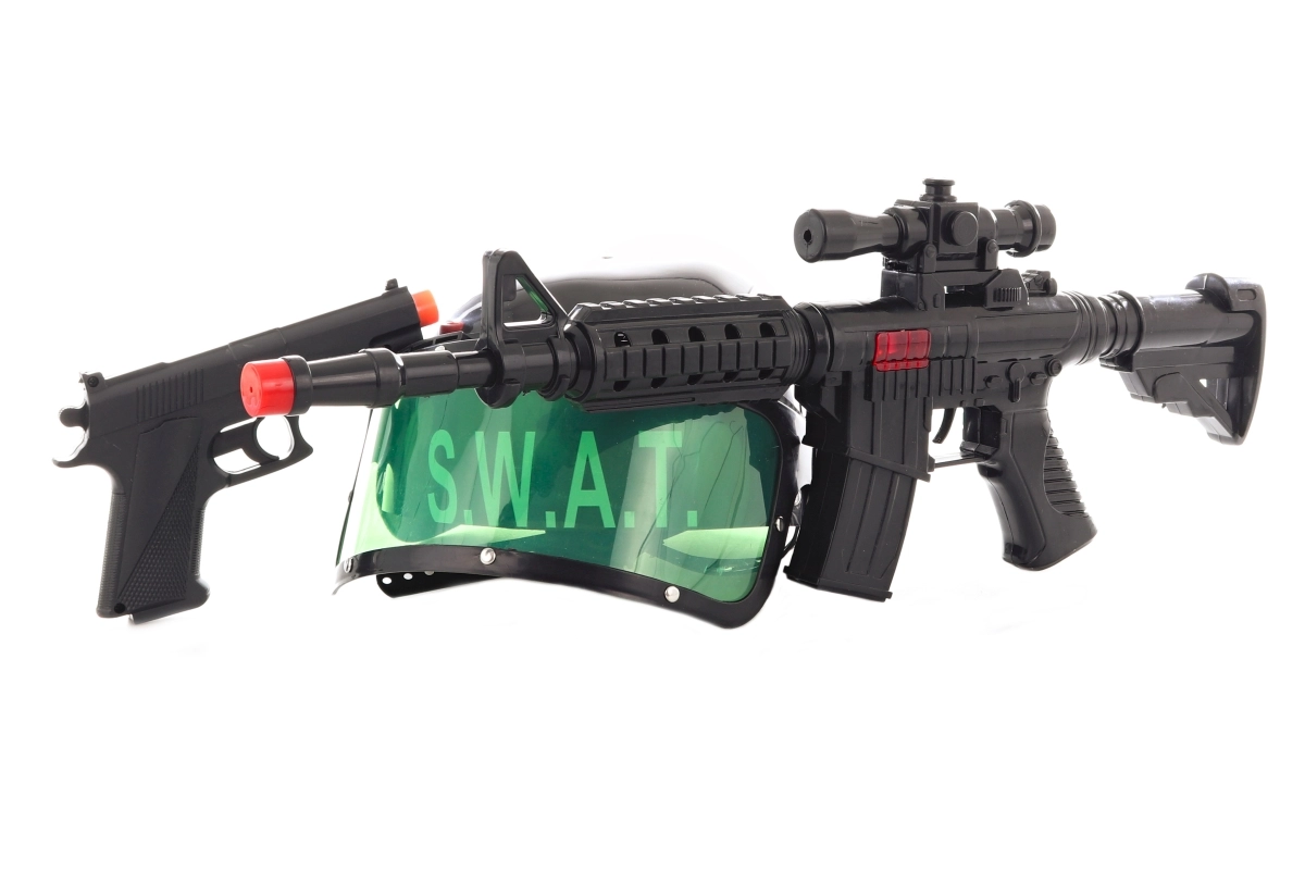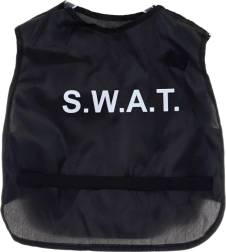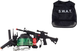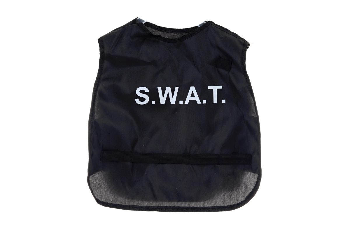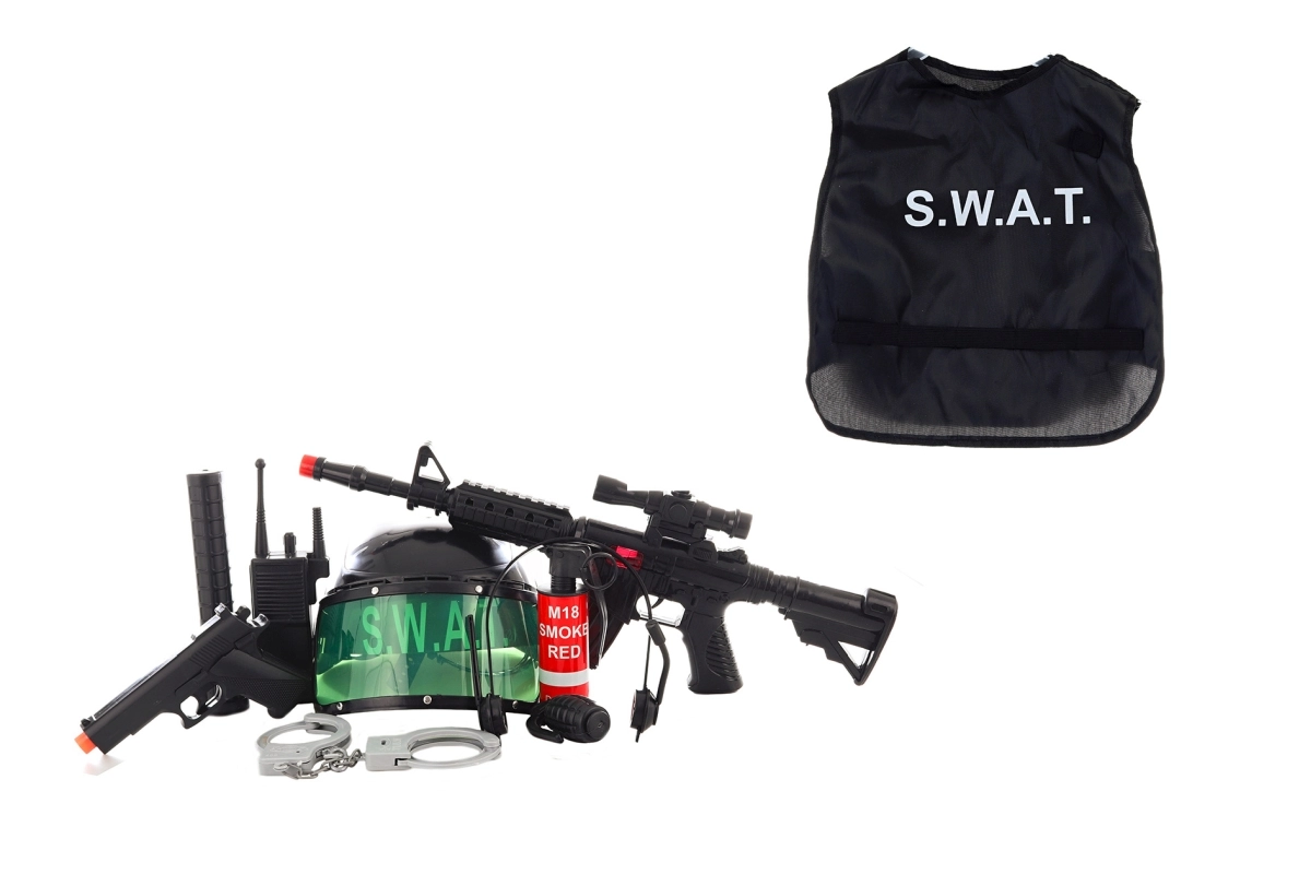 Melna veste ar uzrakstu S.W.A.T., ķivere ar vizieri un bagātīgs piederumu klāsts veido autentisku izskatu lomspēlēm.