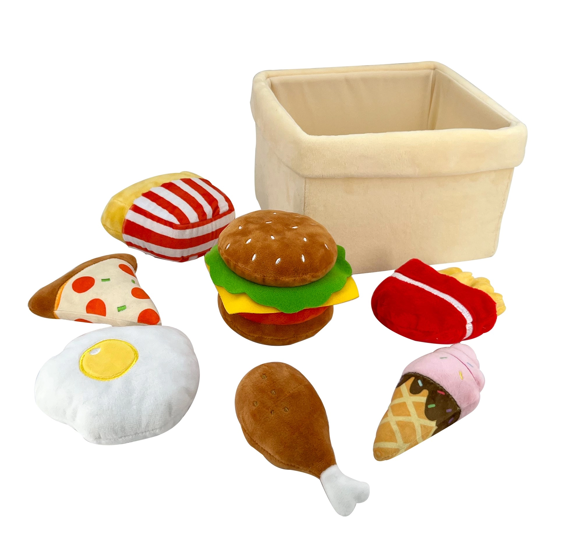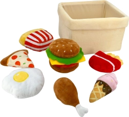 Šis mīlīgais plīša ātro uzkodu komplekts bērnu virtuvē ienes kārtīgu jautrības devu. Praktiskajā groziņā atradīsiet hamburgeru, frī kartupeļus, picu, vistas stilbiņu, vēršaci, mafinu un saldējumu. Katrs gabaliņš ir mīksts, patīkams turēšanai rokā un izskatās pievilcīgi un reālistiski pateicoties izšūtajām detaļām.