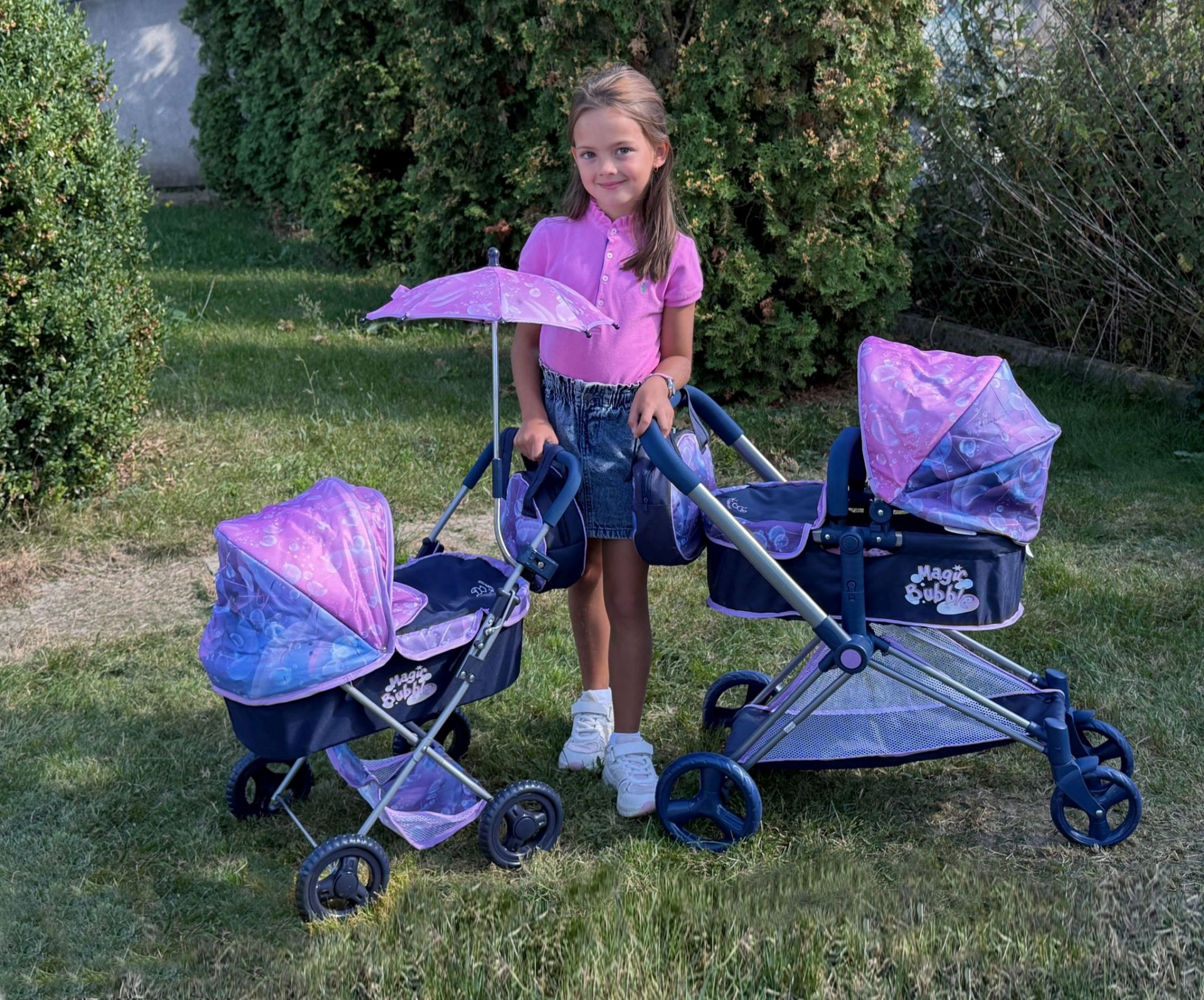 Stilīgi leļļu ratiņi no kolekcijas Magic Bubble izceļas ar maigu varavīksnes dizainu, saliekamu konstrukciju un bagātīgu aprīkojumu. Komplektā ir saulessargs, apaļa soma, matracis un uzglabāšanas grozs. Pateicoties zemajam rokturim un vieglajam svaram, tie ir ideāli piemēroti mazākām meitenēm no 3 gadu vecuma.