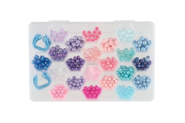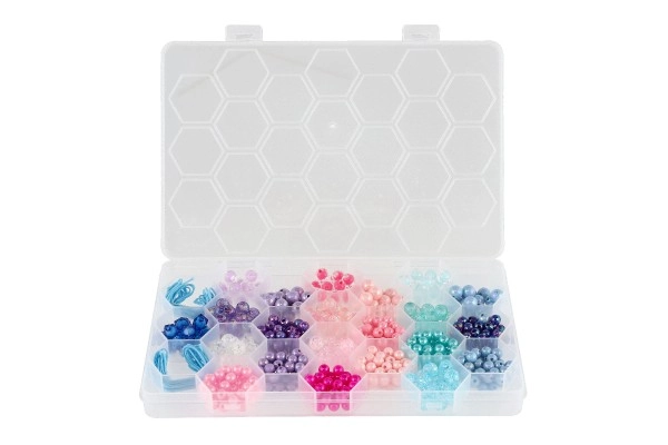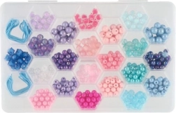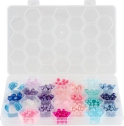 Plastikāta kastīte ar sešstūra formas vāka dizainu atvieglo krellīšu glabāšanu un kārtošanu pēc krāsām.