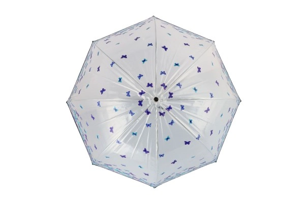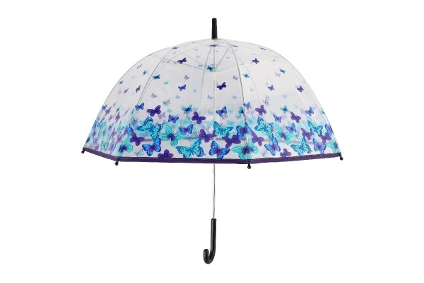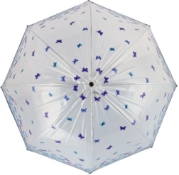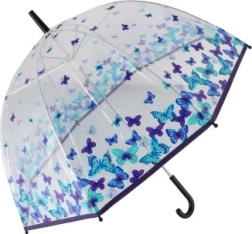 Šis lietussargs izceļas ar pievilcīgu zilo un violeto tauriņu dizainu, kas piešķirs jūsu tērpam unikālu stilu.