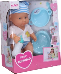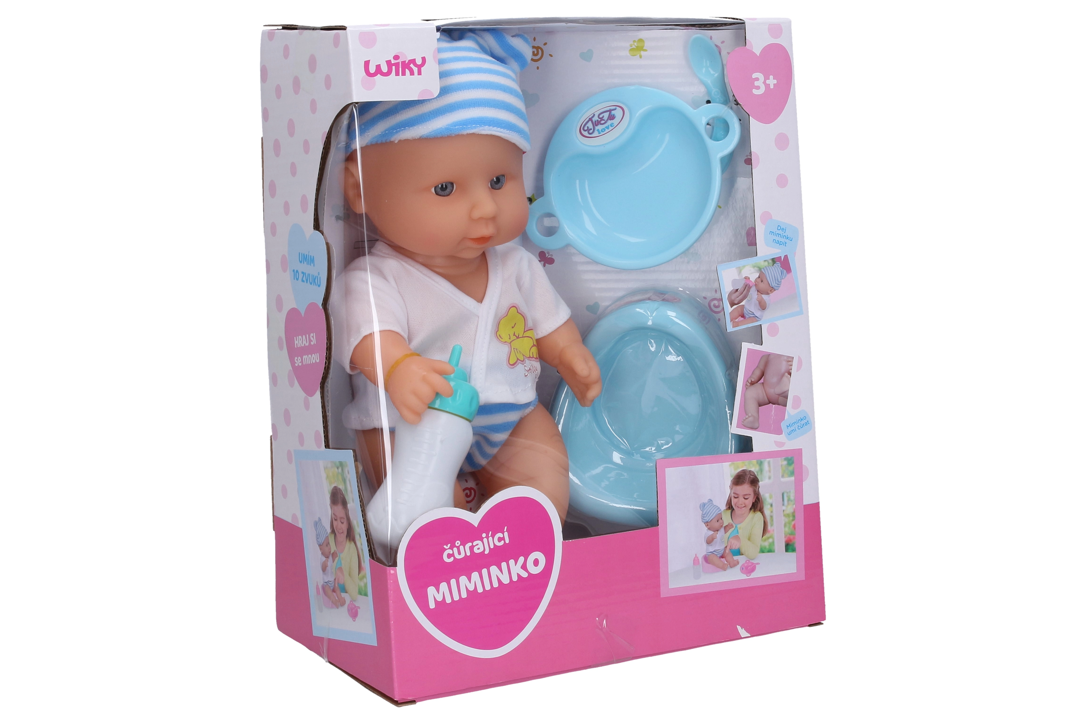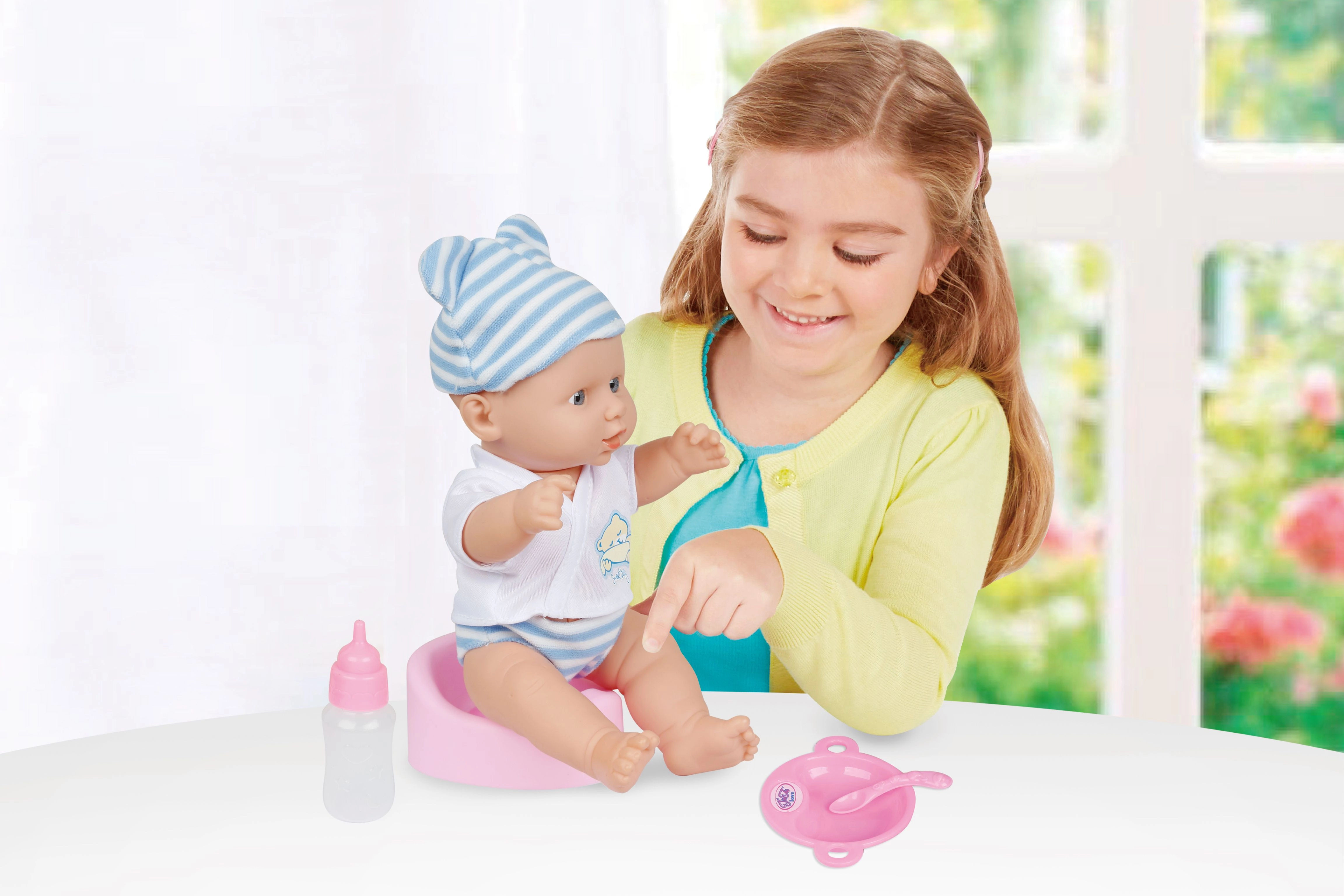Reālistisks bēbītis vecuma lomu spēlēm, 30 cm izmērā, pēc pudelītes izdzeršanas prot čurāt un atskaņo līdz pat 10 dažādām skaņām. Komplektā ietilpst nakts podiņš, pudelīte, šķīvis un karotīte. Baterijas 3× AG13 ir iekļautas iepakojumā.