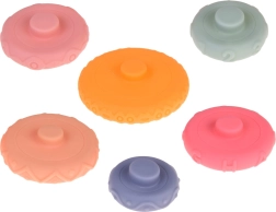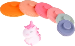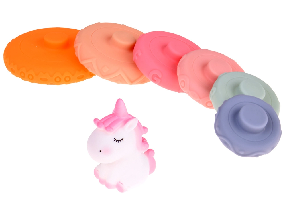 Komplekts ar krāsainiem silikona diskiem un vienradža figūriņu, kas ir ideāli piemērots bērnu sensorajām rotaļām.