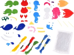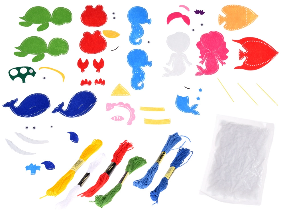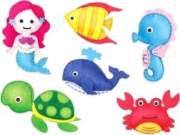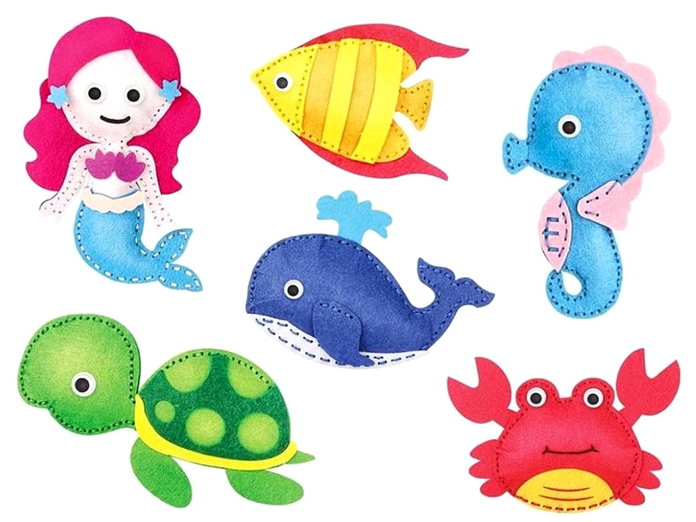 Šis daudzpusīgais komplekts piedāvā visu nepieciešamo, lai sašūtu mīlīgas figūriņas no jūras pasaules – zivtiņu, bruņurupuci, jūras zirdziņu, vaļu, nāriņu un krabi. Filca detaļas ir iepriekš sagatavotas, tāpēc bērni var koncentrēties uz šūšanu un rotāšanu. Pateicoties pašlīmējošiem dekoratīviem elementiem, plastmasas actiņām un krāsainiem izšūšanas diegiem, veidošana ir intuitīva un droša.