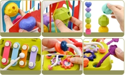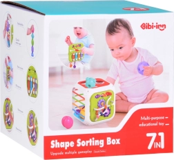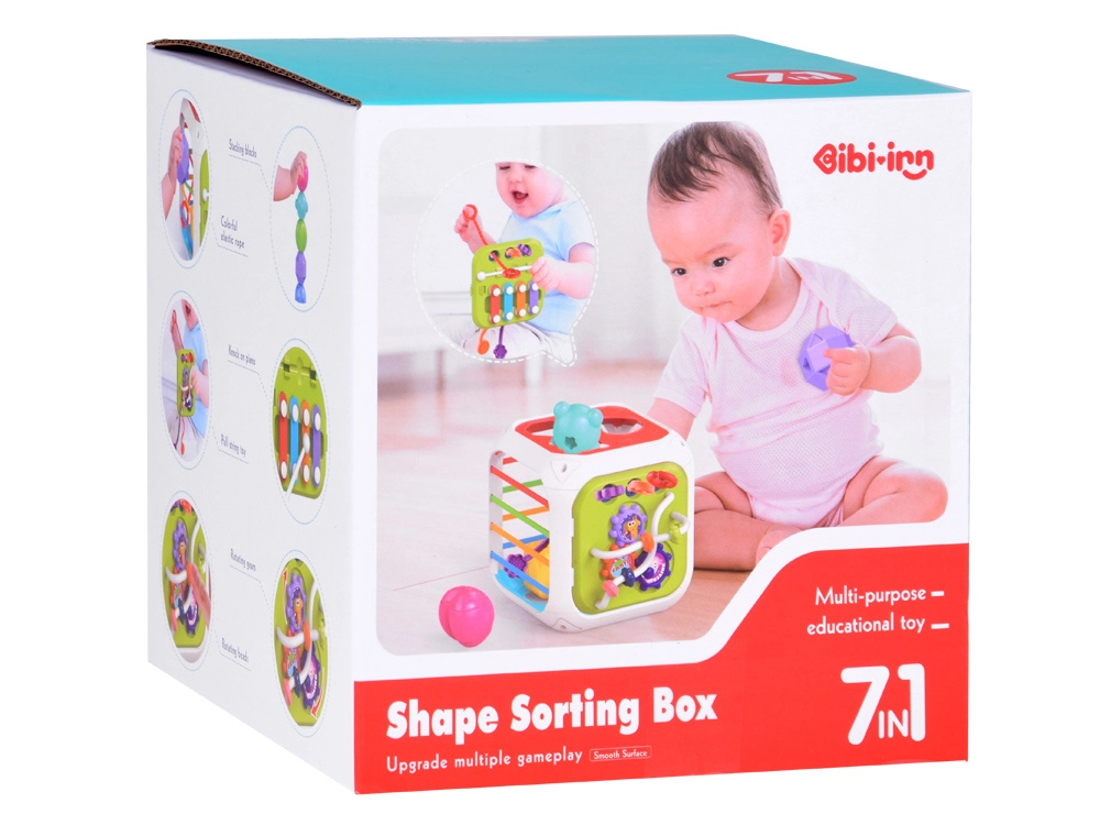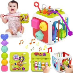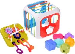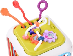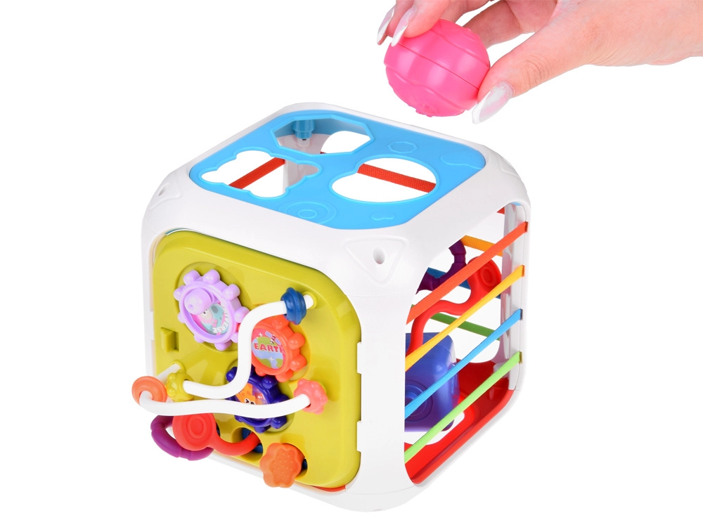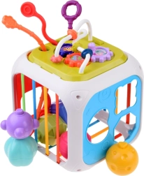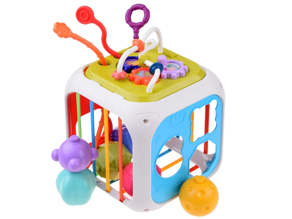 Šis krāsainais izglītojošais kubs no kvalitatīvas plastmasas apvieno bērnu iecienītās aktivitātes vienā kompaktā komplektā. Divas sienas kalpo kā formu šķirotājs ar dažādām atverēm, vēl trīs ir aprīkotas ar elastīgām gumijām klucīšu izspiešanai un taustes treniņam. Divpusējā paneļa siena papildina zvārguļus un vilkšanas auklas ar dažādām tekstūrām vienā pusē un zobratus un bīdāmas krellītes otrā pusē.
