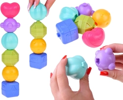 Divas sienas ar atverēm dažādās formās un 6 krāsaini klucīši/ grabuļi māca bērniem atpazīt formas, trenē roku–acu koordināciju un veicina loģisko domāšanu.
