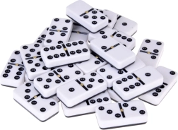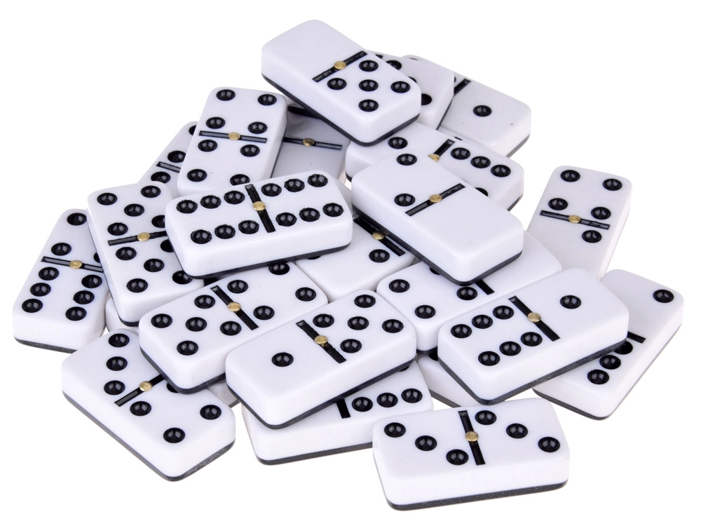 Standarta konfigurācija ar vērtībām 0–6 visām iecienītākajām spēles variācijām. Skaidri melni punkti uz baltiem kauliņiem ērtai saskaitīšanai.