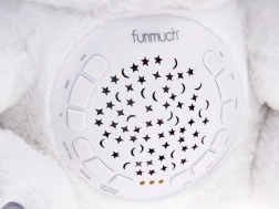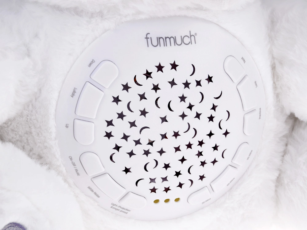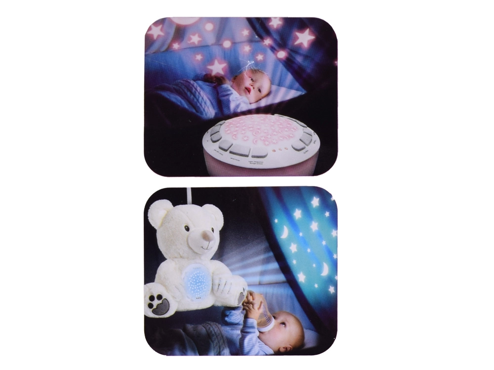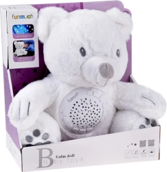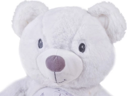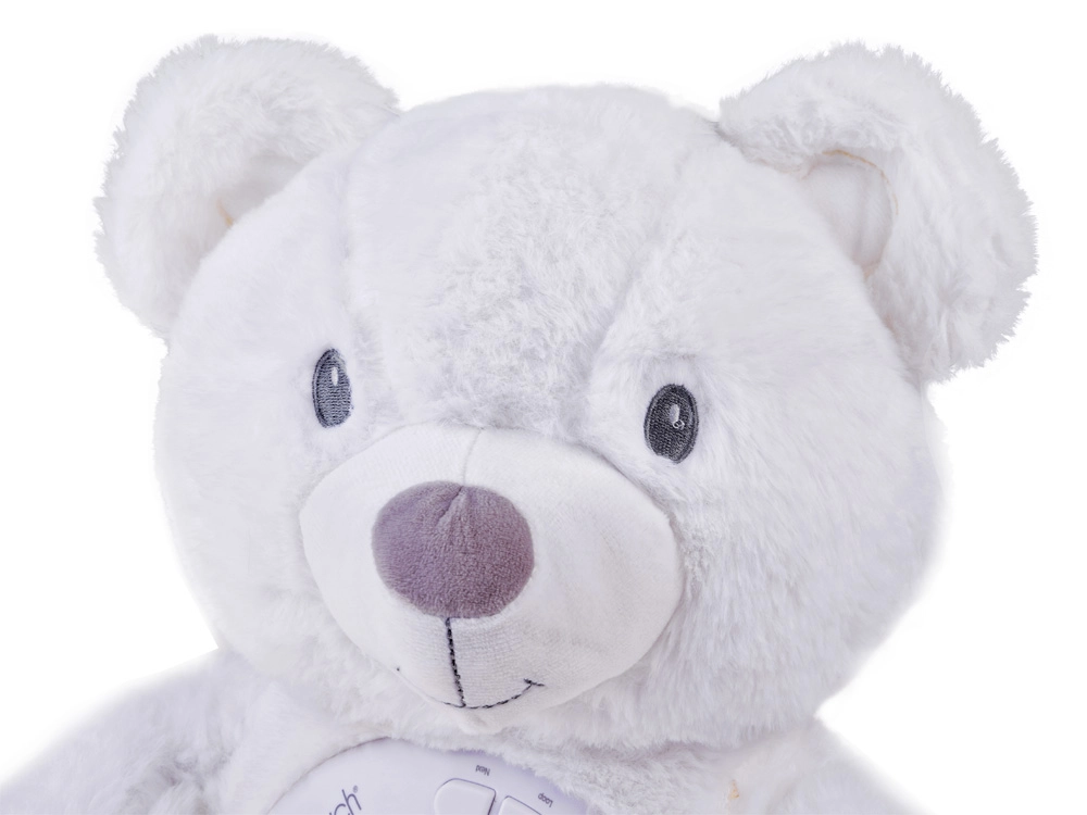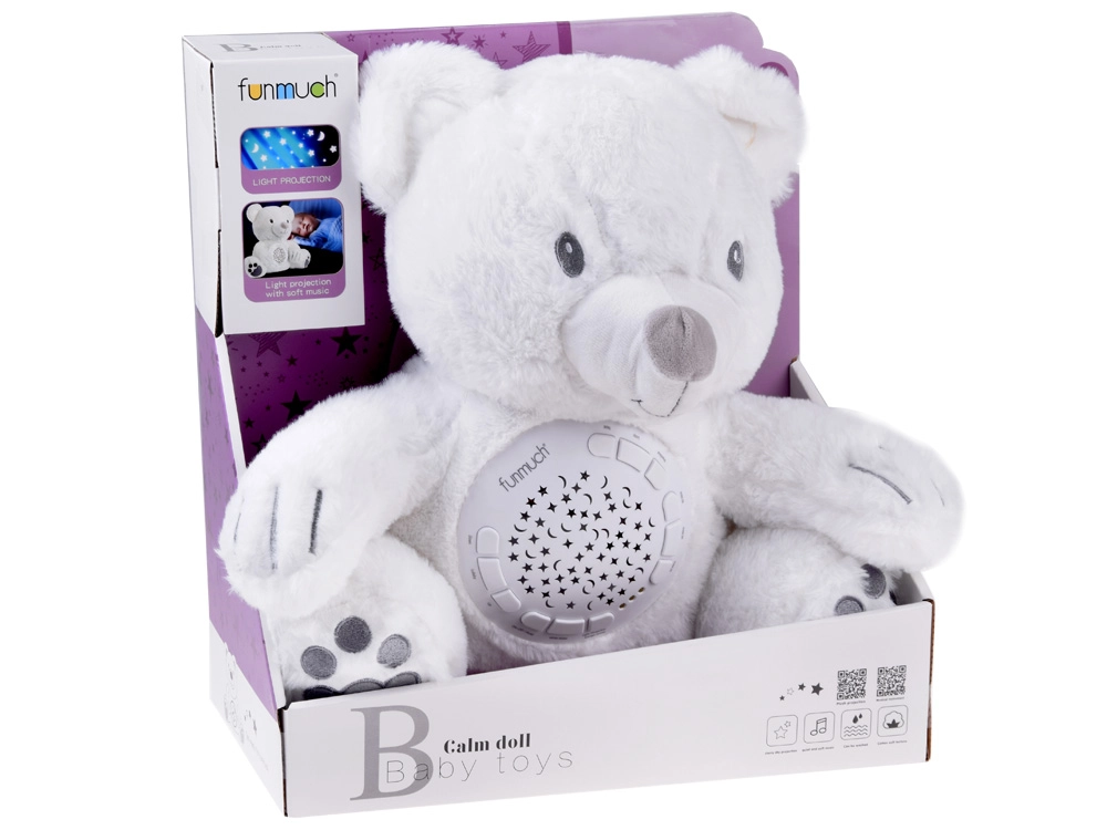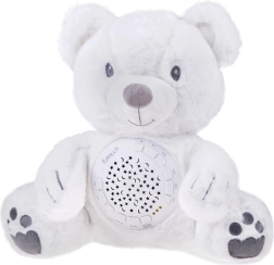 Šis maigi baltais lācītis apvieno rotaļlietu un nakts gaismiņu vienā. Pateicoties 6 maigām šūpuļdziesmām un 5 autentiskām dabas skaņām, tas palīdz mazulim nomierināties un radīt drošības sajūtu. Krāsainais zvaigžņu un mēness projektors uz sienām un griestiem rada nomierinošu atmosfēru, kas kliedē krēslu un veicina mierīgu miegu.