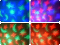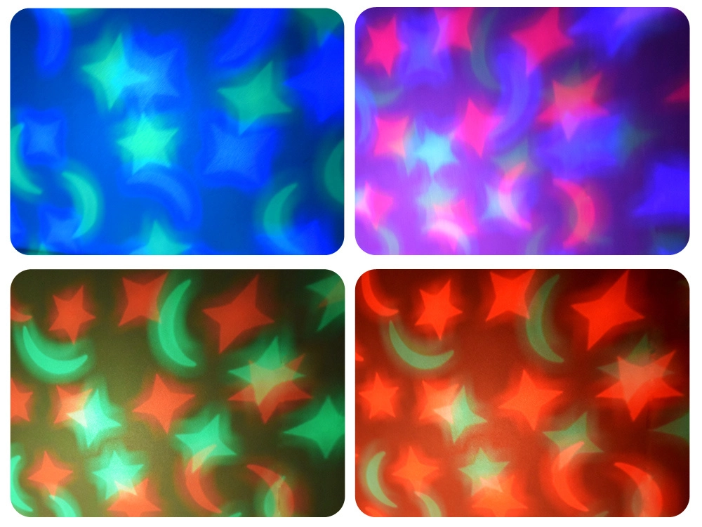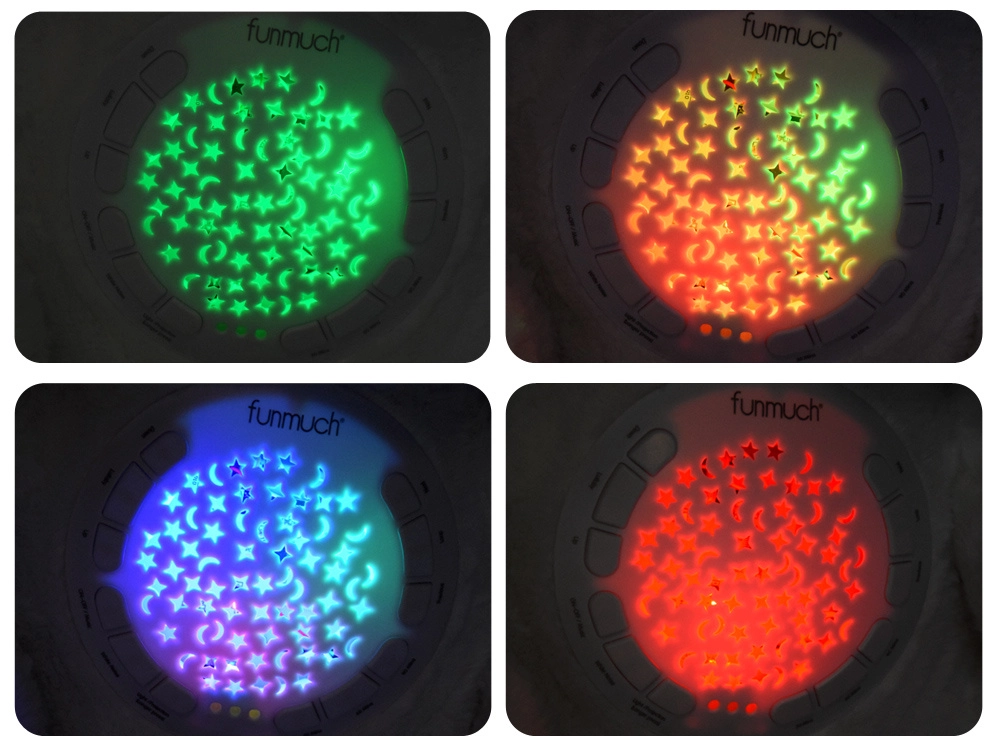 Iebūvētais projektors izzīmē pa istabu krāsainas zvaigznes un mēnesi sarkanos, rozā, zaļos, oranžos un zilajos toņos – ideāli vakara rituāliem.